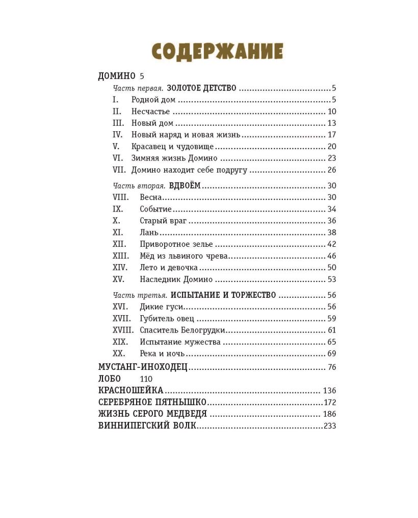 В книгу вошли наиболее известные рассказы знаменитого канадского естествоиспытателя, писателя и художника Эрнеста Сетон-Томпсона: «Мустанг-иноходец», «Лобо», «Красношейка», «Виннипегский волк», «Серебряное пятнышко», «Жизнь серого медведя», а также повесть «Домино». Классический перевод Николая Чуковского. Особую выразительность книге придают великолепные иллюстрации Владимира Канивца. Читатели ценят их за точность деталей и выразительность образов.