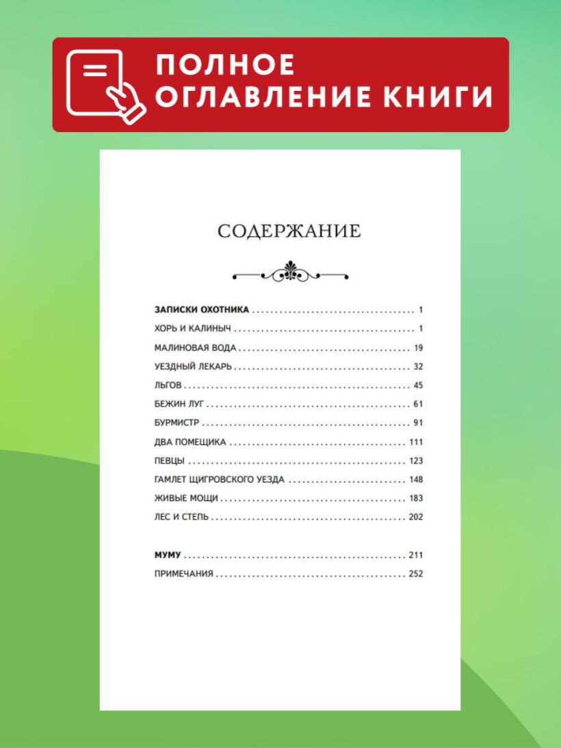 В сборник включены известный рассказ «Муму» и несколько произведений из цикла «Записки охотника». Проза Ивана Тургенева впечатляет тонким чувствованием природы и деталями бытовой жизни крестьян и помещиков.