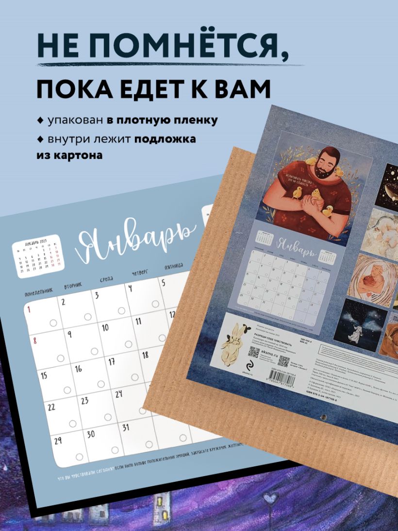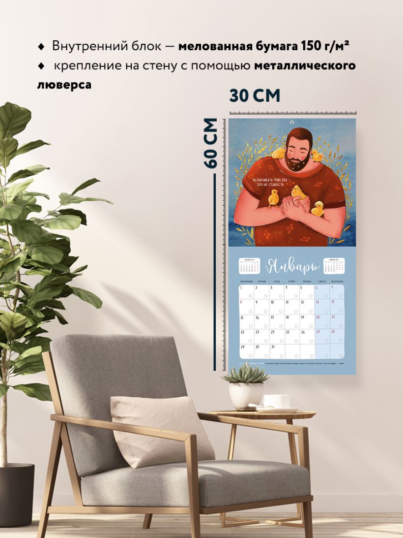 Календарь с иллюстрациями художницы Дарьи Крюковой (активная аудитория в Инстаграм). Отличный подарок подруге, сестре, маме, дочери. Каждый разворот дополнен поддерживающей фразой из книги Юлии Булгаковой «Разреши себе чувствовать» (32 000 подписчиков в Инстаграм). Внутри трекер эмоций: в сетке можно помечать, какие эмоции преобладали каждый день — позитивные или негативные.
