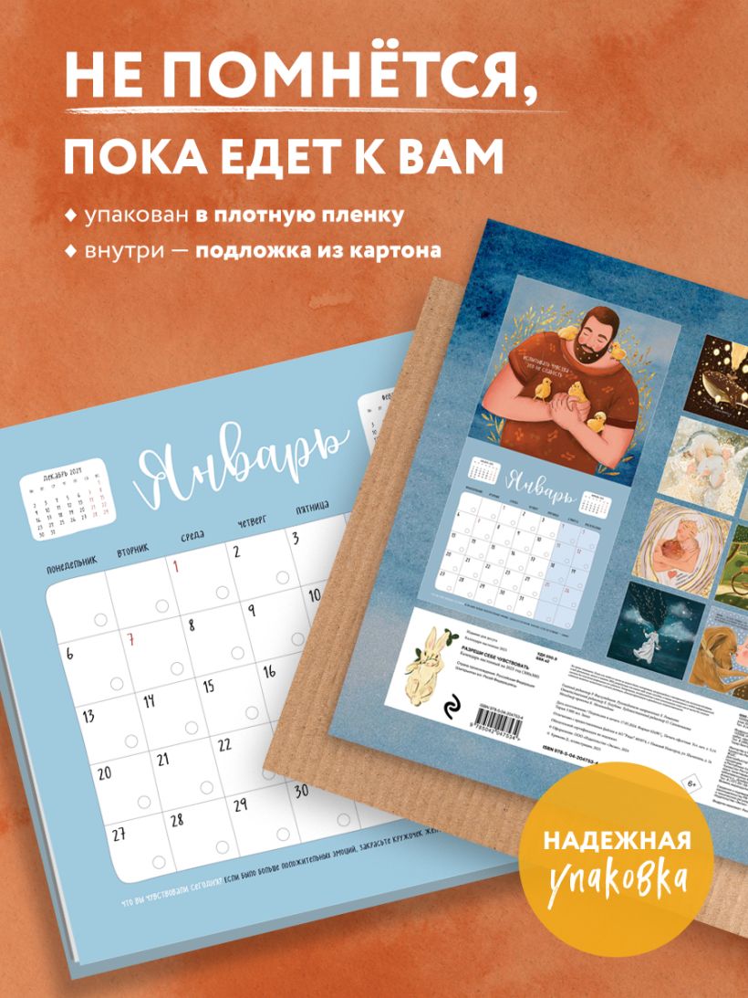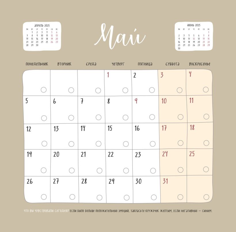 Календарь с иллюстрациями художницы Дарьи Крюковой. Отличный подарок подруге, сестре, маме, дочери. Каждый разворот дополнен поддерживающей фразой из книги Юлии Булгаковой «Разреши себе чувствовать». Внутри трекер эмоций: в сетке можно помечать, какие эмоции преобладали каждый день — позитивные или негативные.