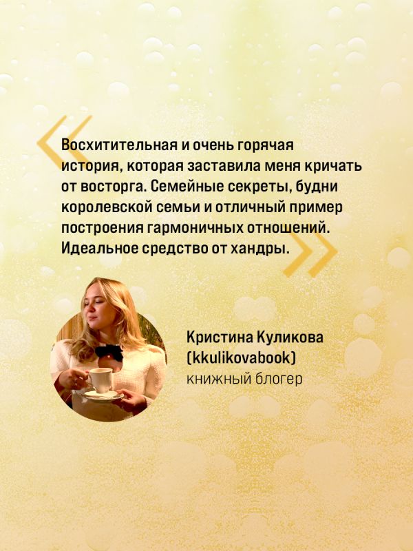 «Восхитительная и очень горячая история, которая заставила меня кричать от восторга. Семейные секреты, будни королевской семьи и отличный пример построения гармоничных отношений. Идеальное средство от хандры». — Кристина Куликова (kkulikovabook), книжный блогер