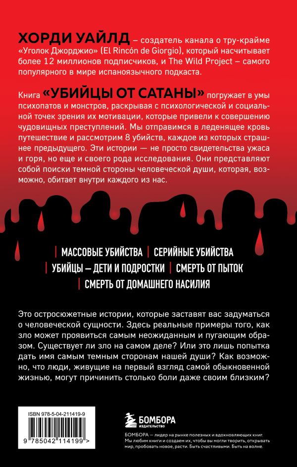 УБИЙЦЫ ОТ САТАНЫ: Существует ли зло само по себе или оно – неотделимая часть каждого из нас? Эта книга – не просто сборник убийств с описанием преступления от начала до конца. У каждого случая есть свои предыстория и последствия. Автор Хорди Уайлд, криминальный психолог, представляет нам полную картину жизни преступника, вместе с тем подробно анализирует его поведение, опираясь на детские годы жизни и уклад общества в пределах конкретной страны и конкретного времени. Зло еще никогда не было таким тихим и незримым. Углубитесь в криминологию и приподнимите завесу тайны нечеловеческих преступлений грешников-убийц, души которых погибли безвозвратно: