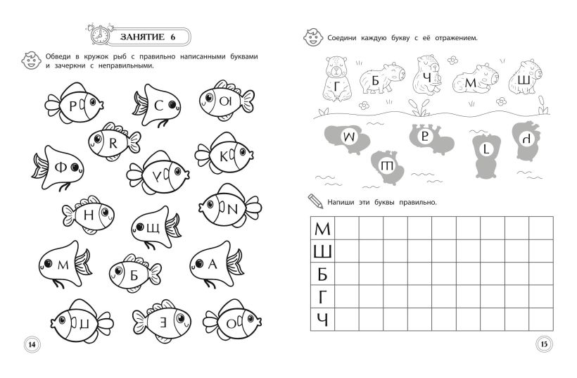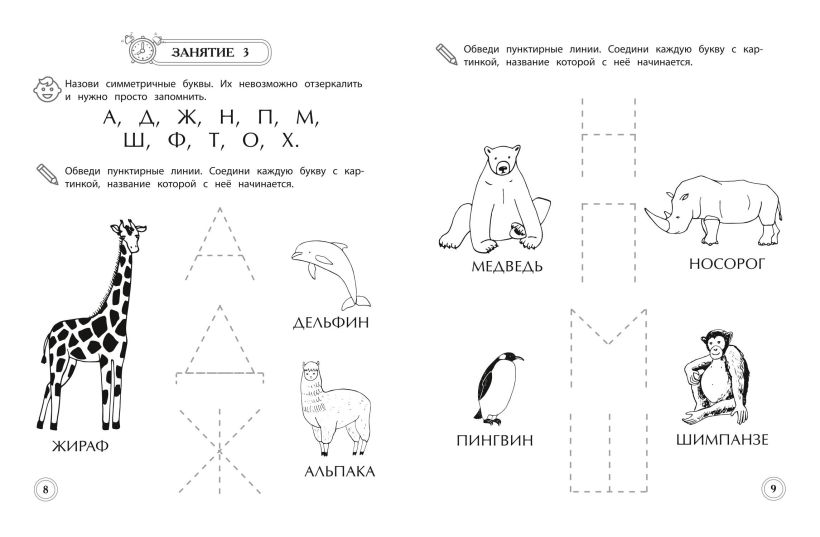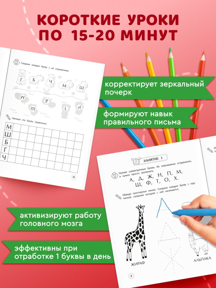 Пособие станет отличным помощником в профилактике дисграфии и навыков письма у старших дошкольников. Задания, представленные в книге, доступны и разнообразны, что позволит ребенку менять виды деятельности и не уставать. Эффективность занятий по коррекции зеркального почерка зависит от последовательности. Не нужно отрабатывать технику написания сразу всех элементов. Более результативной будет работа по исправлению 1—2 буквы в день. Выполняя разноплановые игровые упражнения, ребенок сможет, как настоящий волшебник, превращать палочки в буквы и обводить по пунктирным линиям печатные буквы двумя руками одновременно; научится различать правильные буквы и их зеркальное отражение; потренируется писать печатные буквы на клетчатом поле; будет дорисовывать части букв, проходить буквенные лабиринты.