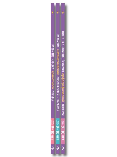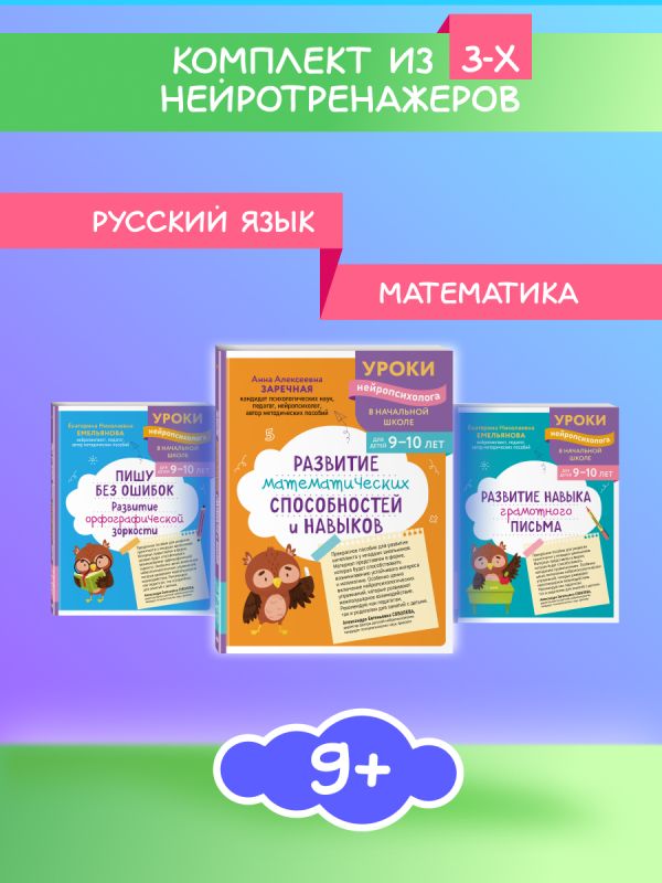 В комплект из трех развивающих тетрадей для детей 9—10 лет входят книги по развитию навыка грамотного письма, орфографической зоркости и математических способностей и навыков. Пособия подготовлены практикующими нейропсихологами, которые каждый день помогают учащимся начальной школы справиться с проблемами, возникающими в обучении. Цель набора книг — повысить общую грамотность учеников 3—4 классов, развить у них умение видеть ошибки и исправлять их правильно, а также сформировать и закрепить навыки счёта, приёмы сложения и вычитания, умножения и деления, решения логических задач, развить абстрактное мышление и пространственные представления.