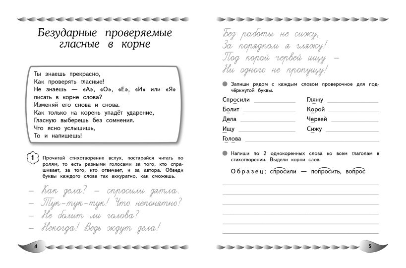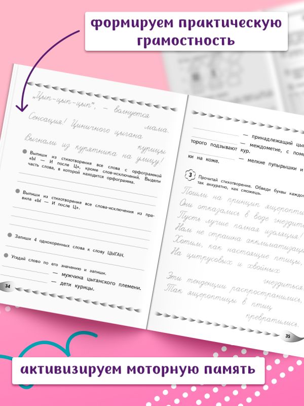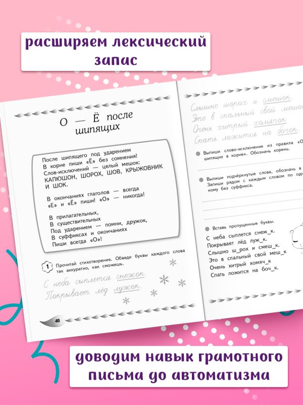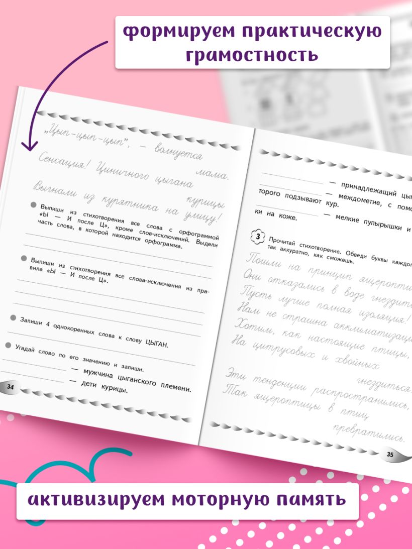 Пособие по развитию навыка грамотного письма от издательства «Эксмо» подготовлено практикующим нейропсихологом, который каждый день помогает учащимся начальной школы справиться с проблемами, возникающими в обучении. Цель книги — повысить общую грамотность учеников 3—4 классов. Нейротренажер разделен на главы по отдельным правилам. Сами правила русской орфографии сформулированы в стиле рэп. Их можно не только читать, но и пропеть и протанцевать — так будет легче их понять и запомнить. Во главу угла поставлен метод обведения букв по контуру, который дает очень высокий результат, одновременно корректируя почерк, формируя образ слова и активизируя моторную память. Вопросы и задания каждой темы выстроены в определенном порядке, что способствует активизации механизмов соответствующих отделов мозга и обосновано нейропсихологически. Внутри глав имеются забавные стихотворные тексты, к каждому из которых дается несколько несложных заданий. Ко всем упражнениям, кроме творческих, имеются ответы, позволяющие учащимся проверить уровень своих знаний. Использование тренажера в качестве дополнительного материала поможет ребенку своевременно устранить всевозможные сложности в усвоении школьного материала и формировании необходимых навыков. Кроме того, в серию «Уроки нейропсихолога в начальной школе» входят книги: «Развитие разных видов памяти и внимания: для детей 8—10 лет», «Исправление почерка и профилактика дисграфии: для детей 8—10 лет», «Пишу без ошибок. Развитие орфографической зоркости: для детей 9—10 лет», «Решаю быстро и правильно. Сложение и вычитание: для детей 7—8 лет», «Развитие математических способностей и навыков: для детей 9—10 лет», «Говорю грамотно. Развитие речевого потенциала: для детей 8—10 лет».