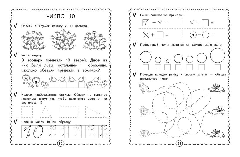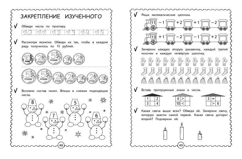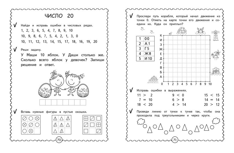 Каждый разворот книги — отдельное занятие, рассчитанное на 15 минут и состоящее из занимательных заданий, направленных на изучение основ математики. Занимаясь, ребёнок будет считать и писать числа от 0 до 20, научится решать примеры и задачи, сравнивать числа, познакомится с прямым и обратным счётом, с понятиями «соседи числа», «двузначные числа», «чётное число», «нечётное число», «прямая», «отрезок», с основными геометрическими фигурами.