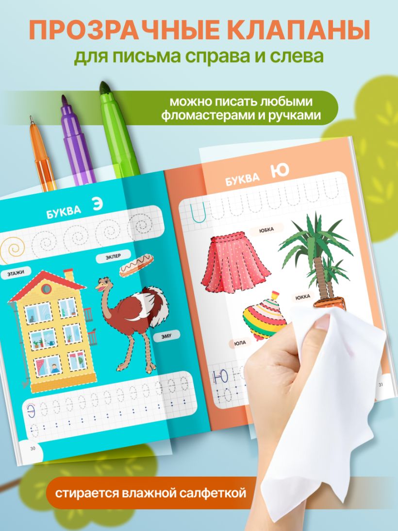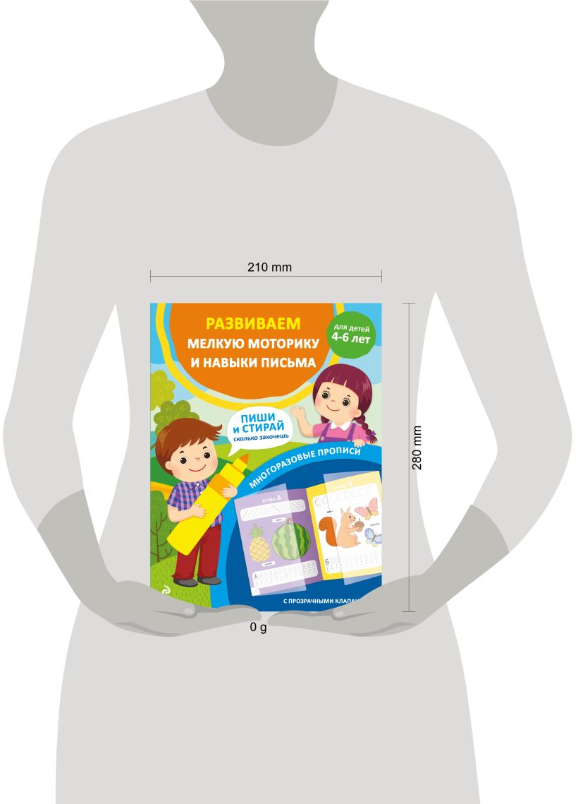 Это необычная многоразовая тетрадь поможет детям от 4 до 6 лет развить мелкую моторику и научиться писать печатные буквы. Бумажные страницы справа и слева накрываются прозрачными клапанами из специального материала — по нему можно многократно писать любым фломастером или маркером, а потом стирать написанное влажной салфеткой. Пользоваться такими прописями можно бесконечно долго, совершенствуя правильность выполнения графических заданий и точность написания букв. Развитие мелкой моторики способствует совершенствованию когнитивных функций мозга: памяти, внимания, логического мышления, которые помогут ребёнку эффективнее учиться. Лучше, если ребёнок начнёт знакомиться с пособием в присутствии взрослого, который может задать наводящие вопросы или попросить выполнить какое-то задание несколько раз. В дальнейшем дошкольник может с удовольствием выполнять знакомые упражнения самостоятельно. Ребёнок будет писать в прописях много-много раз, не задумываясь: «А вдруг не получится?» Игры с такими развивашками полезны как для девочек, так и для мальчиков и станут отличным подарком ребенку на день рождение или Новый год. Книга Издательства «ЭКСМО» станет для ребенка любимым тренажёром, который поможет ему успешно подготовиться к поступлению в первый класс.