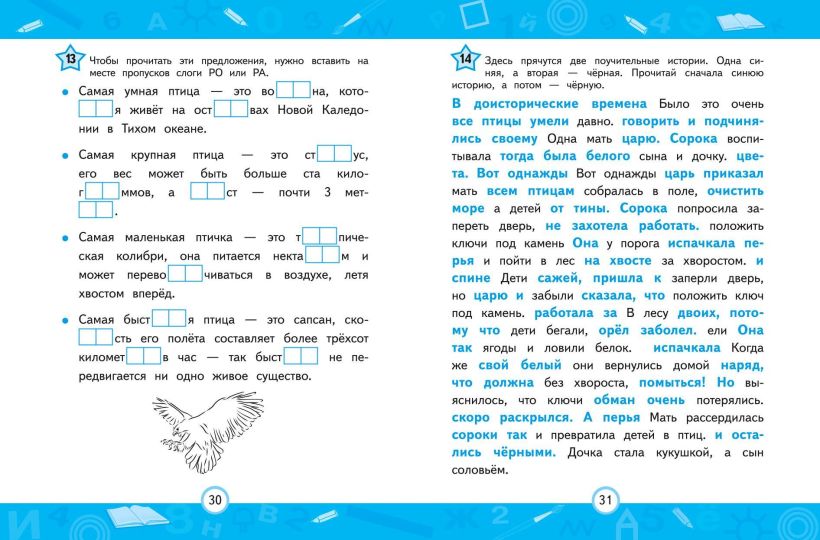 Цель книги — сделать из ученика настоящего читателя, который бегло читает, понимает прочитанное и постоянно совершенствует навык чтения. Развивающее пособие от издательства «Эксмо» поможет младшему школьнику довести навык беглого чтения до автоматизма, повысить уровень внимания, расширить словарный запас, узнать много интересной и полезной информации о флоре и фауне.