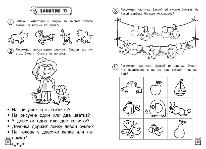 Задания в тетради направлены на то, чтобы научить дошкольника запоминать увиденное и прочитанное, концентрировать свое внимание, замечать отличия и улавливать сходство. Эти навыки помогут при обучении ребенка в дальнейшем, так как будущему школьнику будет проще разбираться в потоке информации и удерживать в памяти знания, полученные на уроке.