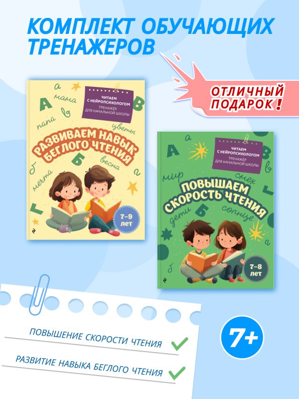 В комплект от издательства "Эксмо" для детей 7-9 лет входят 2 обучающих тренажера от практикующего нейропсихолога: "Повышаем скорость чтения" и "Развиваем навык беглого чтения". Пособия содержат интересные игровые упражнения. Ребёнок будет быстро и четко читать столбики слогов и слов, стихотворения, сказки, узнавать слова, в которых буквы переставлены местами, читать небольшие тексты, вставлять буквы, отгадывать кроссворды, шарады, расшифровывать пословицы.