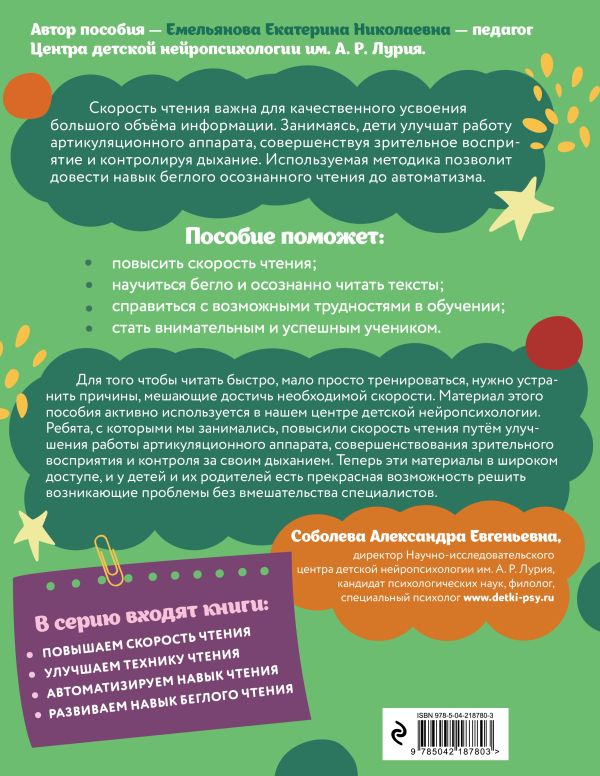 Нейротренажёр «Повышаем скорость чтения» включает в себя задания на поиск слов в цепочках из букв, нахождение правильно написанного слова; на чтение словесных пирамидок, стихотворений, сказок по ролям разными голосами. Занимаясь по книге «Развиваем навык беглого чтения», ребёнку предстоит быстро и чётко читать столбики слогов и слов, отгадывать слова, в которых буквы переставлены местами, читать небольшие тексты, вставлять буквы, отгадывать кроссворды, шарады, расшифровывать пословицы. Пособия направлены на развитие скорости и беглости чтения. Включают в себя разнообразные игровые задания, направленные на улучшение артикуляционного аппарата, чувства ритма, контроля дыхания, активизацию зрительной и орфографической памяти, формирование устойчивости внимания.