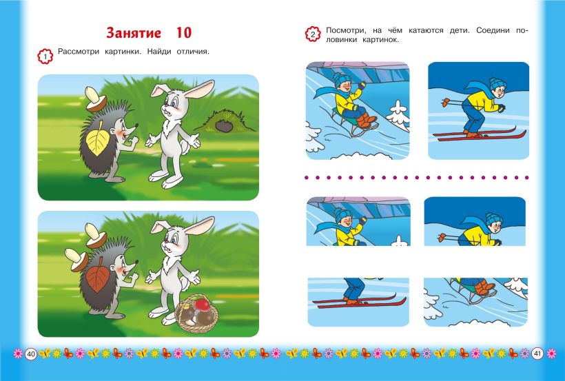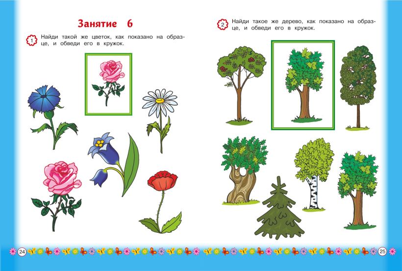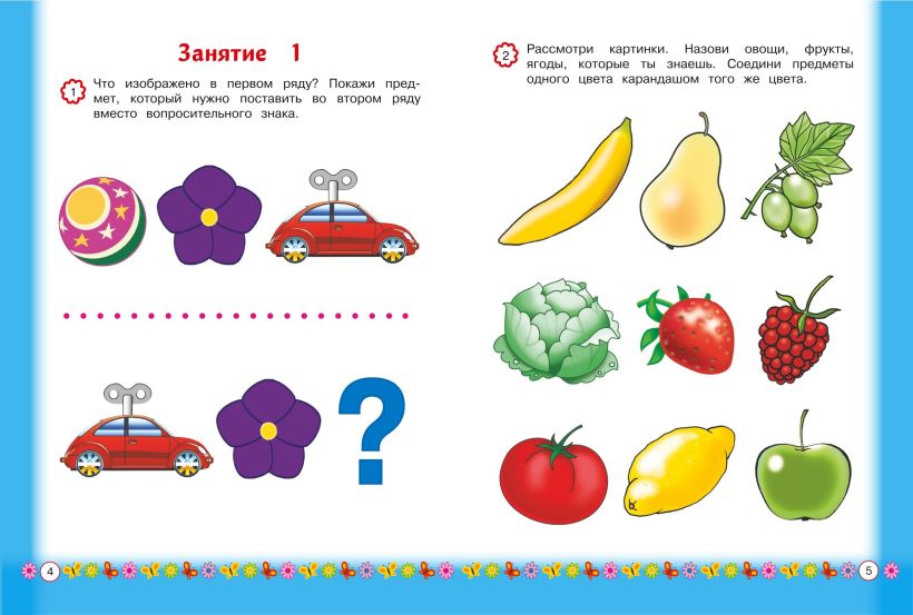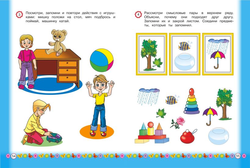Выполняя увлекательные игровые упражнения, сравнивая картинки, соединяя половинки рисунков, находя смысловые пары, раскрашивая по образцу, запоминая предметы, малыш сможет потренировать приобретенные навыки.