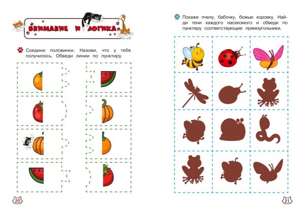 Задания направлены на развитие мелкой моторики, логики, речи, мышления и внимания. Ребенок научится проводить различные типы линий, потренирует кисть руки, будет проходить лабиринты и соединять логические пары. Он повторит простые геометрические фигуры и основные цвета, изучит числа от 1 до 5, познакомится с животным и растительным миром. Чтобы учеба вызывала улыбку, все упражнения малышу помогают выполнять милые животные — пушистые котики.
