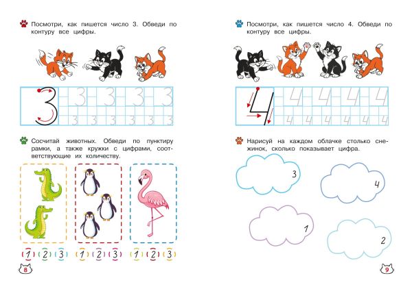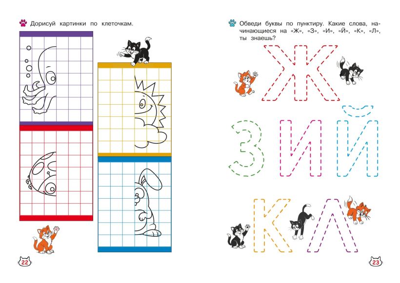 Задания направлены на развитие речи, мелкой моторики, логики, мышления и внимания. Ребенок научится проводить различные типы линий, потренирует кисть руки, будет проходить лабиринты. Он познакомится с числами от 1 до 10 и с буквами русского алфавита, закрепит их образ в памяти. Чтобы учеба вызывала улыбку, все упражнения малышу помогают выполнять милые животные — пушистые котики.