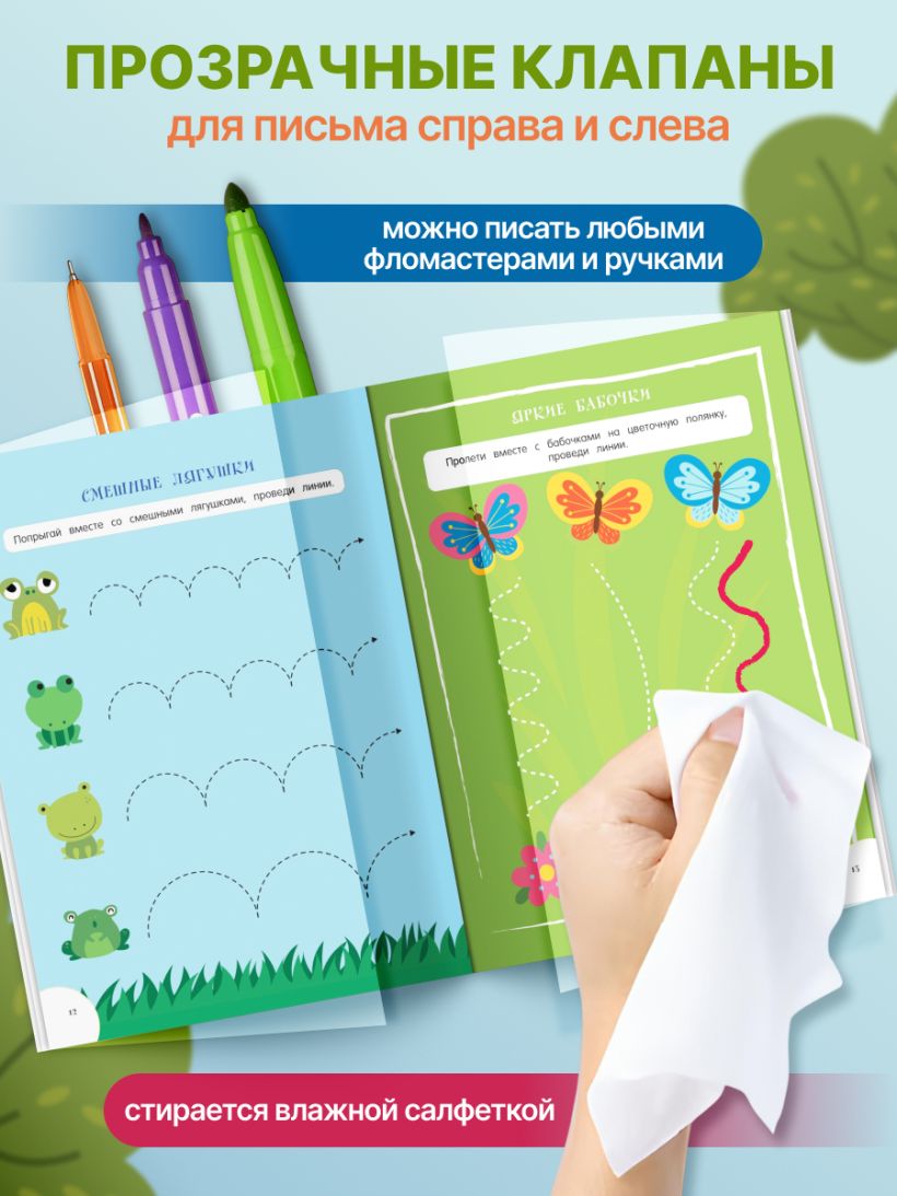 Это необычная многоразовая тетрадь для детей от 2-х до 3-х лет: бумажные страницы справа и слева накрываются прозрачными клапанами из специального материала — по нему можно многократно писать любым фломастером или маркером, а потом стирать написанное влажной салфеткой. Пользоваться такими прописями можно бесконечно долго, совершенствуя правильность выполнения графических заданий, точность написания цифр и букв. Пособие поможет ребёнку развить мелкую моторику и совершенствовать когнитивные функции мозга: память, внимание, логическое мышление. Большинство заданий в книге имеет несколько вариантов решения, поэтому лучше, если ребёнок начнёт знакомиться с пособием в присутствии взрослого, который может задать наводящие вопросы или попросить малыша выполнить какое-то упражнение несколько раз. В дальнейшем дошкольник может с удовольствием выполнять знакомые упражнения самостоятельно. Ребёнок будет писать в прописях много-много раз, не задумываясь: «А вдруг не получится?» Развивающие игрушки, как и развивашки от 2-х лет, способствуют формированию учебных навыков у дошкольников. Игры с такими пособиями полезны как для девочек, так и для мальчиков и станут отличным подарком ребенку на день рождения или Новый год. Книга издательства «ЭКСМО» станет для малыша любимой игрушкой, которую он не захочет выпускать из рук.