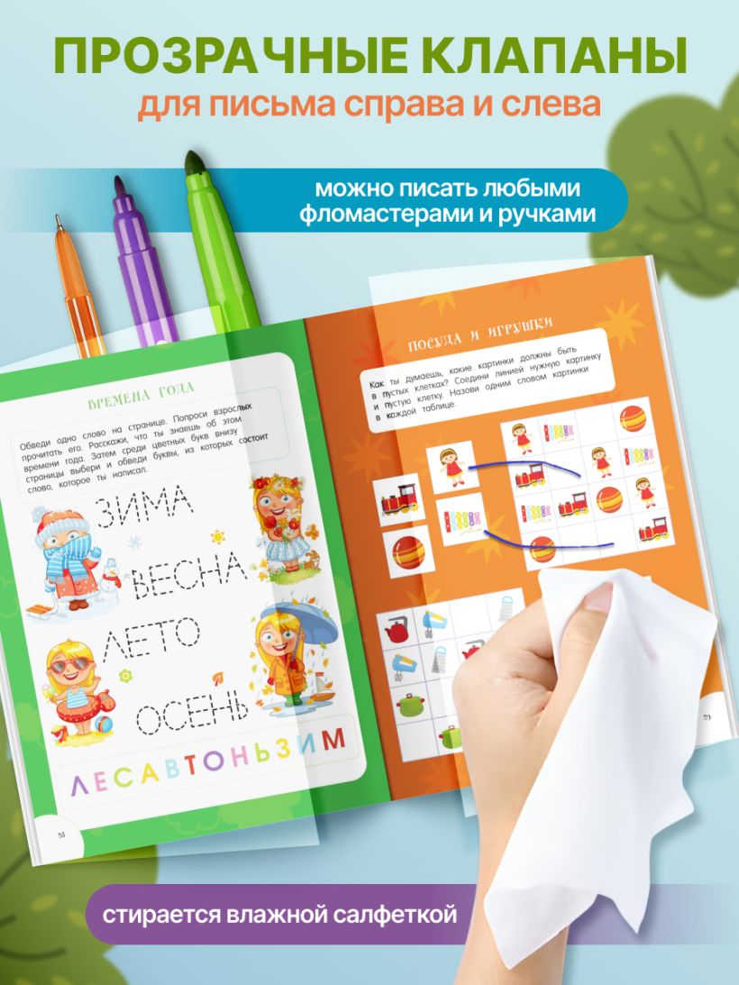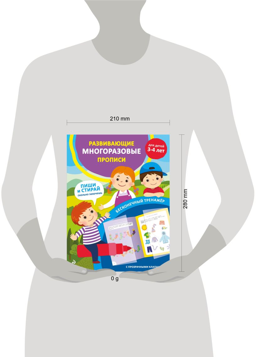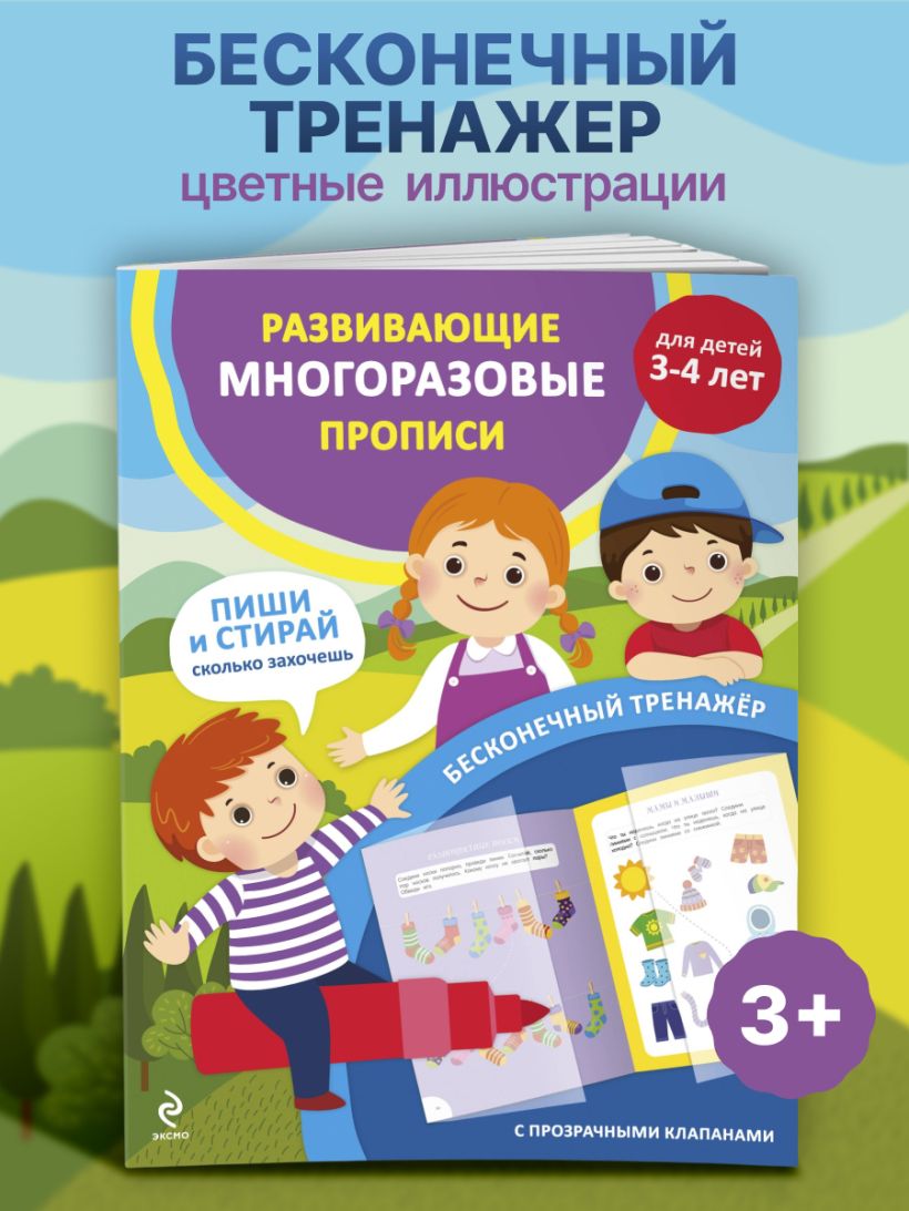 Это необычная многоразовая тетрадь для детей от 3-х до 4-х лет: бумажные страницы справа и слева накрываются прозрачными клапанами из специального материала — по нему можно многократно писать любым фломастером или маркером, а потом стирать написанное влажной салфеткой. Пользоваться такими прописями можно бесконечно долго, совершенствуя правильность выполнения графических заданий, точность написания цифр и букв. Пособие поможет ребёнку развить мелкую моторику и совершенствовать когнитивные функции мозга: память, внимание, логическое мышление. Большинство заданий в книге имеет несколько вариантов решения, поэтому лучше, если ребёнок начнёт знакомиться с пособием в присутствии взрослого, который может задать наводящие вопросы или попросить малыша выполнить какое-то упражнение несколько раз. В дальнейшем дошкольник может с удовольствием выполнять знакомые упражнения самостоятельно. Ребёнок будет писать в прописях много-много раз, не задумываясь: «А вдруг не получится?» Развивающие игрушки, как и развивашки от 3-х лет, способствуют формированию учебных навыков у дошкольников. Игры с такими пособиями полезны как для девочек, так и для мальчиков и станут отличным подарком ребенку. Книга Издательства «ЭКСМО» станет для малыша любимой игрушкой, которую он не захочет выпускать из рук.