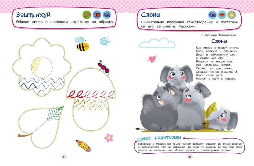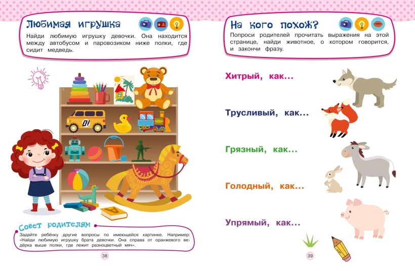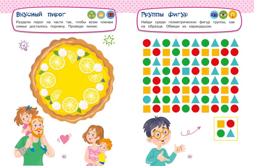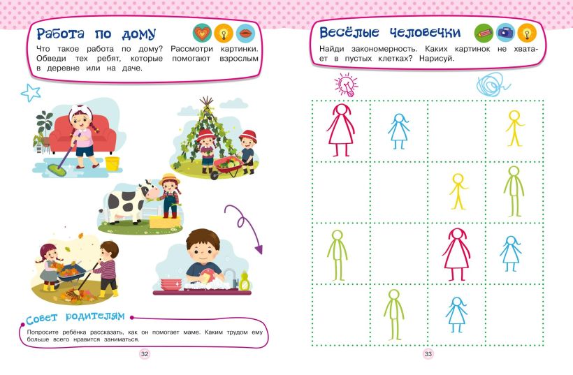 Дошкольник закрепит знание основных математических понятий: форма, размер, количество, длина, вес, время. Научится сортировать предметы по разным признакам, определять их положение в пространстве, решать практические задачи на поиск закономерностей и распределение. Расширит словарный запас, научится рассуждать и выстраивать повествование. Потренируется распознавать эмоции и вести диалог. Развивающие задания нейропсихологической направленности помогут ребёнку научиться удерживать внимание, эффективно запоминать увиденное и услышанное, логически мыслить, фантазировать и развить мелкую моторику рук.