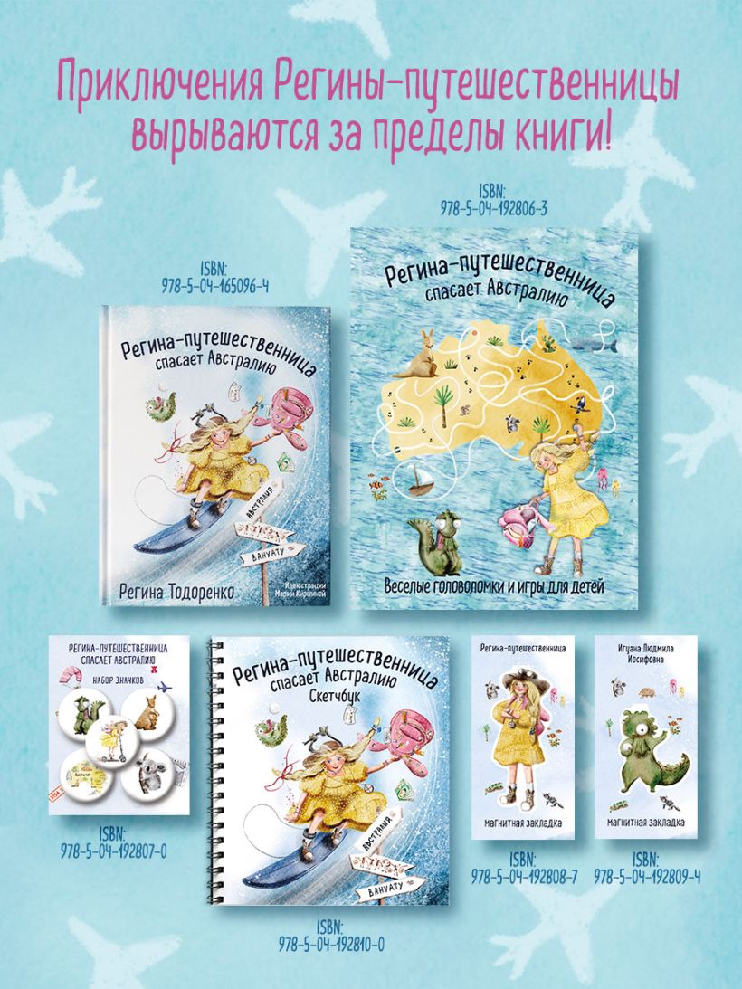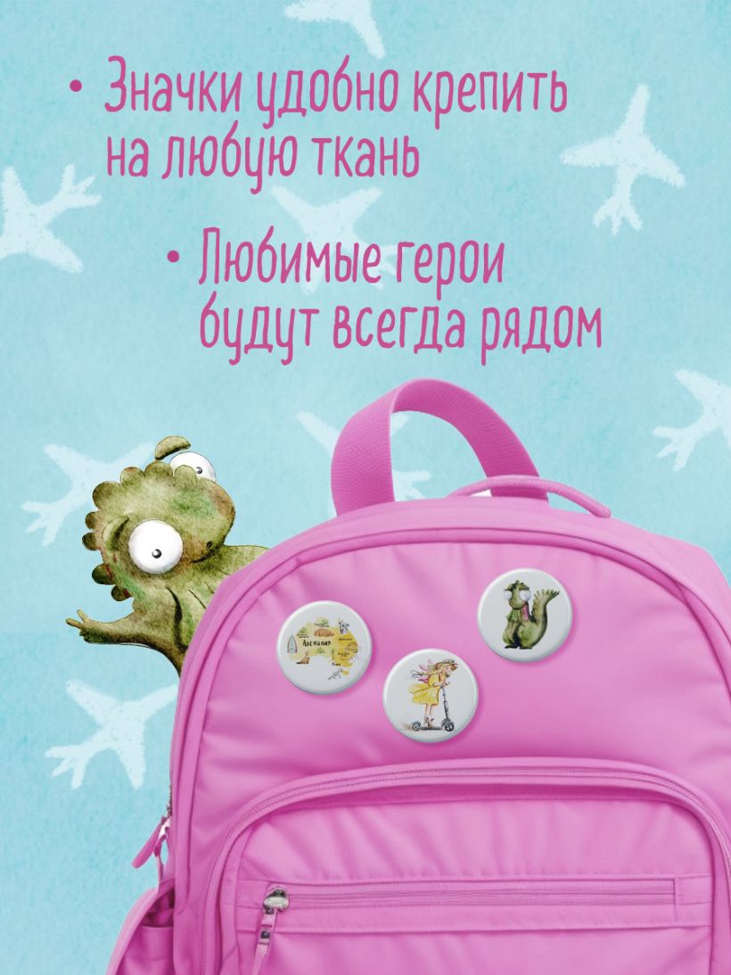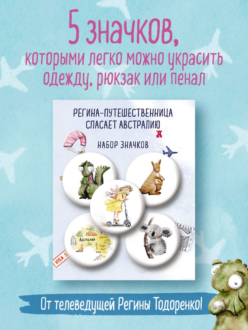 Уже прочитали историю о том, как отважная путешественница Регина и ее верный друг, игуана Людмила Иосифовна, посетили Австралию? Узнали от них как остановить цунами, почему вулканы бывают полезны и что такое эпоха сновидений? Тогда этот набор значков специально для вас и вашего ребенка! Значки выполнены из плотного пластика с удобным креплением, диаметр значка – 38 мм. В набор входит 5 значков - украсьте ими детский рюкзак для путешествий, одежду и все, что захочет ваш ребенок!