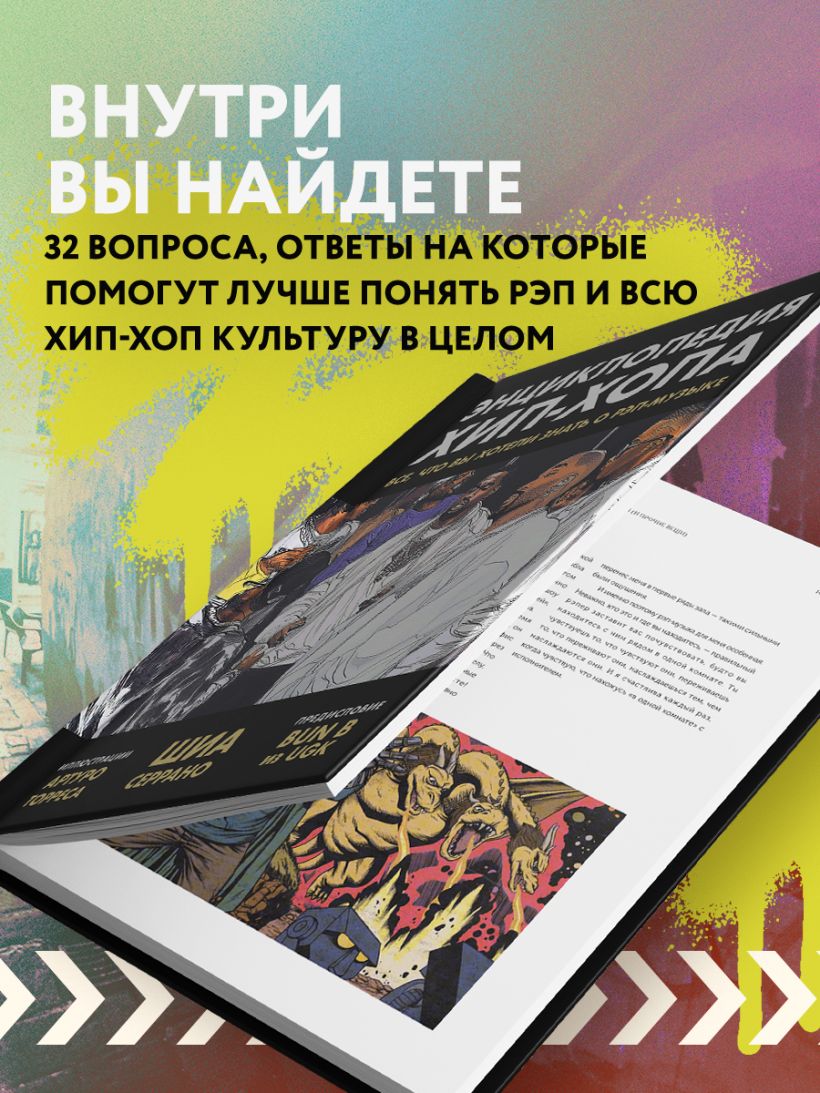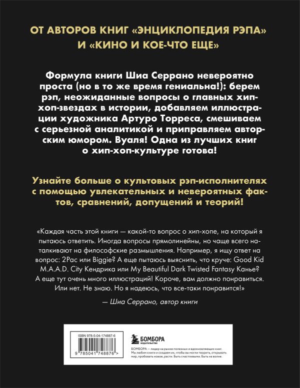 Книга от автора бестселлеров «Энциклопедия рэпа» и «Кино и кое-что еще». Шиа Серрано объединил все лучшее, что было в его предыдущих книгах. Формула проста: берем рэп, неожиданные вопросы о главных хип-хоп звездах в истории, добавляем иллюстрации художника Артуро Торреса, смешиваем с серьезной аналитикой и приправляем авторским юмором. Вуаля! Одна из лучших книг о культуре хип-хопа готова.