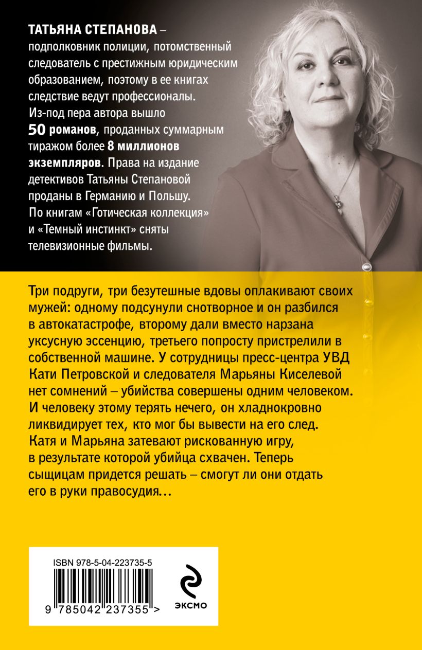 Три подруги, три безутешные вдовы оплакивают своих мужей: одному не вовремя подсунули снотворное и он разбился в автокатастрофе, второму дали вместо нарзана уксусную эссенцию, третьего попросту пристрелили в собственной машине. У сотрудницы Пресс-центра УВД Кати Петровской и следователя Марьяны Киселевой нет сомнений — убийства совершены одним и тем же человеком. И человеку этому терять нечего, он хладнокровно ликвидирует тех, кто мог бы вывести на его след. Катя и Марьяна затевают рискованную игру, в результате которой убийца схвачен. А вот теперь сыщицам придется решить — смогут ли они отдать его в руки правосудия…