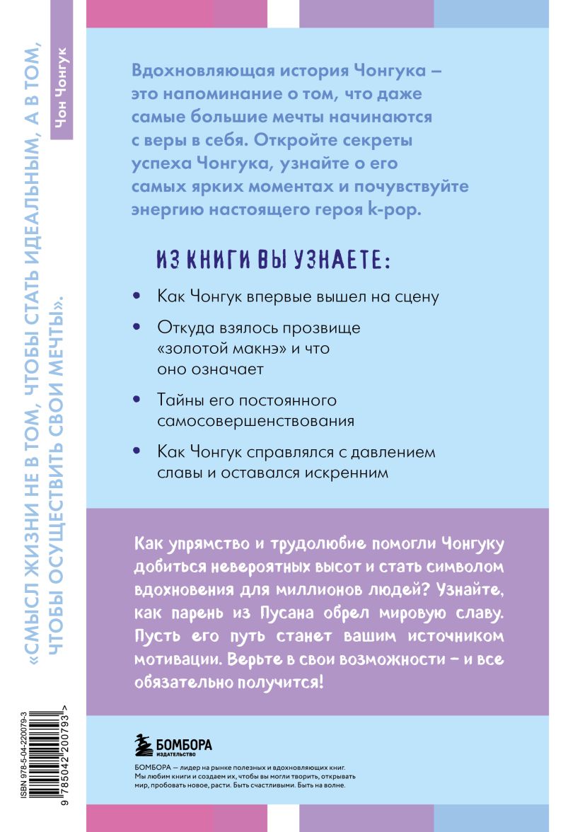 Его история — вдохновение для всех, кто мечтает о достижении своих целей. В книге вы найдете ценные уроки о преодолении трудностей, вере в себя и решительности. Чонгук — пример того, что даже самые смелые мечты могут стать реальностью при настойчивости и страсти.
