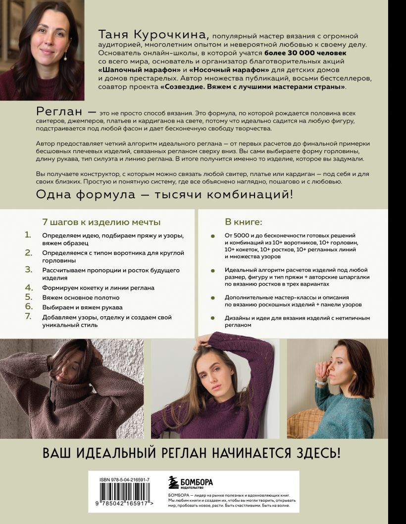 Эта книга — не сборник описаний, а настоящий конструктор бесшовных плечевых изделий, связанных на спицах регланом сверху вниз.