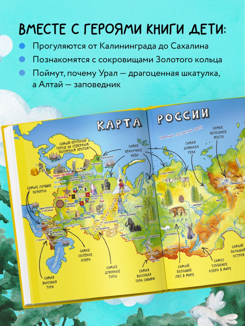Захватывающее путешествие двух героев по самым интересным местам нашей необъятной родины! Вместе с ними дети узнают, чем славятся города Золотого кольца, где в России находятся пряничный рай и танцующий лес, почему Урал — это драгоценная шкатулка России, а Алтай — самое заповедное место, и что скрывается за загадочными названиями Карелия, Камчатка и Чукотка. Также вы посетите самую высокую в России гору Эльбрус, самое холодное место и самое глубокое на планете озеро Байкал. Книга включает в себя увлекательные задания и игры, а также оригинальные иллюстрации, созданные специально для издания.