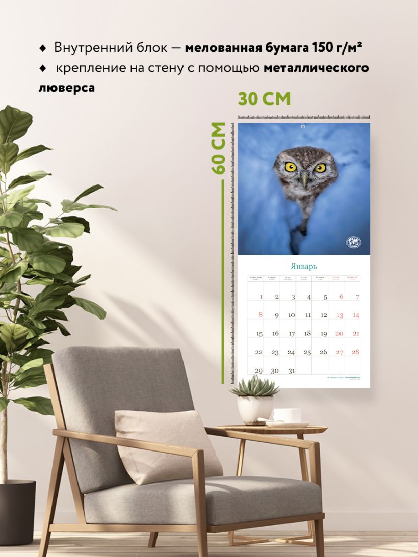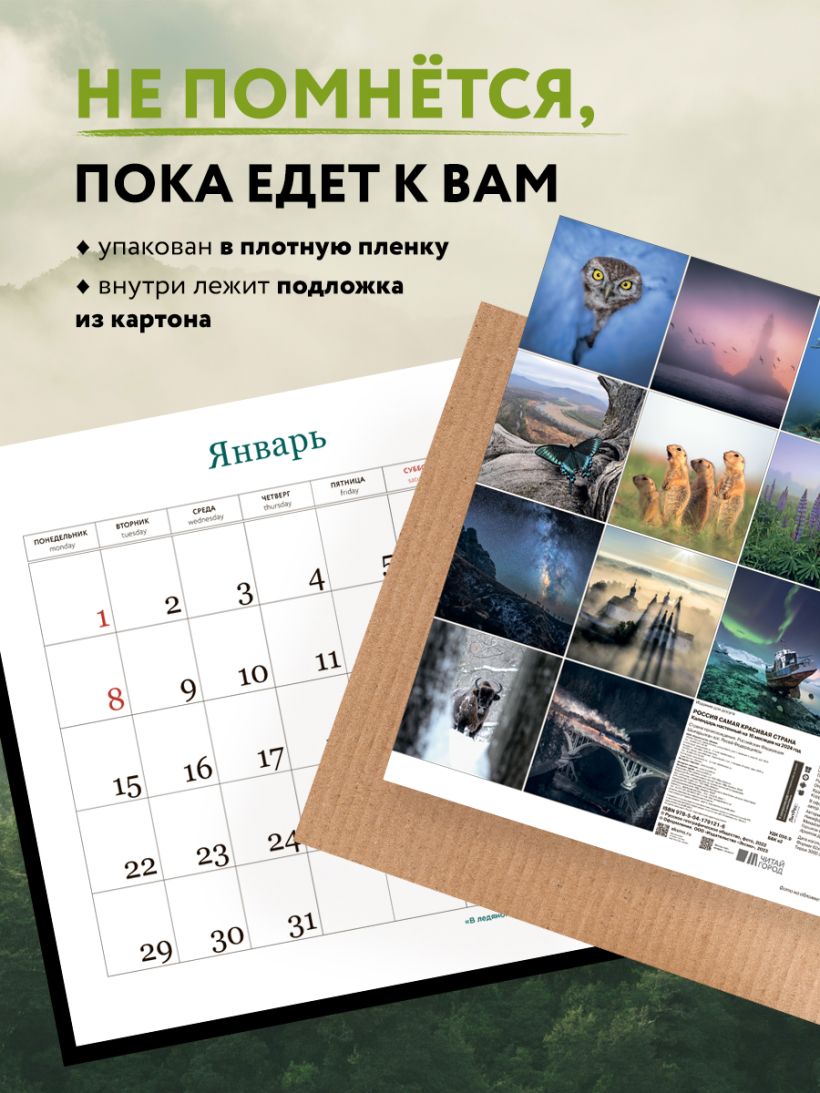 Благодаря большому формату и высокому качеству изображений этот календарь может стать отличным дополнением интерьера. В нем также отмечены выходные дни, а просторная сетка позволяет удобно планировать время и записывать важные события.