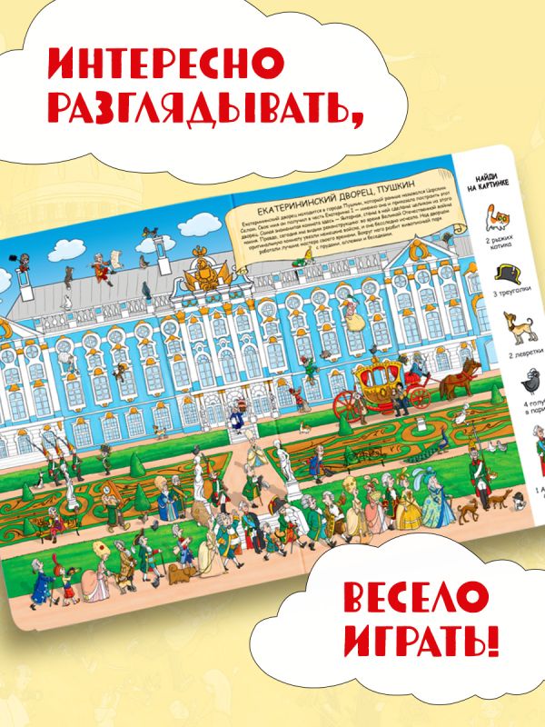 «Найди в Петербурге» — развивающая книга-игра для детей! Яркий виммельбух перенесет юных исследователей на Дворцовую площадь, Невский проспект, праздник «Алые паруса», в Петергоф и в другие знаменитые уголки Северной Венеции. На каждом из 8 разворотов спрятаны десятки предметов, животных и героев, связанных с культурой и историей города, а также емкие описания каждой достопримечательности, чтобы узнавать Петербург стало еще интереснее. Почему эта книга понравится вам и вашему ребенку: • Развивает внимание, память и логику. • Помогает изучать достопримечательности Петербурга в увлекательной форме. • Подходит для совместного чтения и игр всей семьей. • Яркие, детально прорисованные иллюстрации с множеством забавных деталей. Путешествуйте по Санкт-Петербургу, не выходя из дома — ищите, находите и узнавайте новое вместе с ребенком!