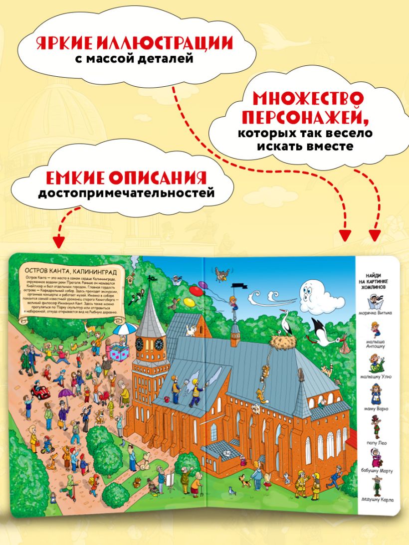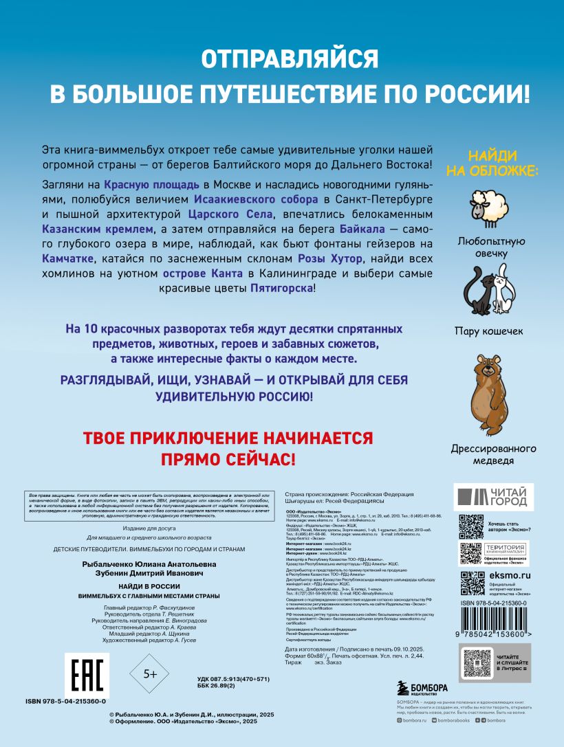 Яркий виммельбух отправит юных исследователей в путешествие по разным уголкам России. На каждом из 10 разворотов спрятаны десятки предметов, животных и героев, связанных с культурой и историей знаковых мест, а также емкие описания каждой достопримечательности, чтобы узнавать свою страну стало еще интереснее.