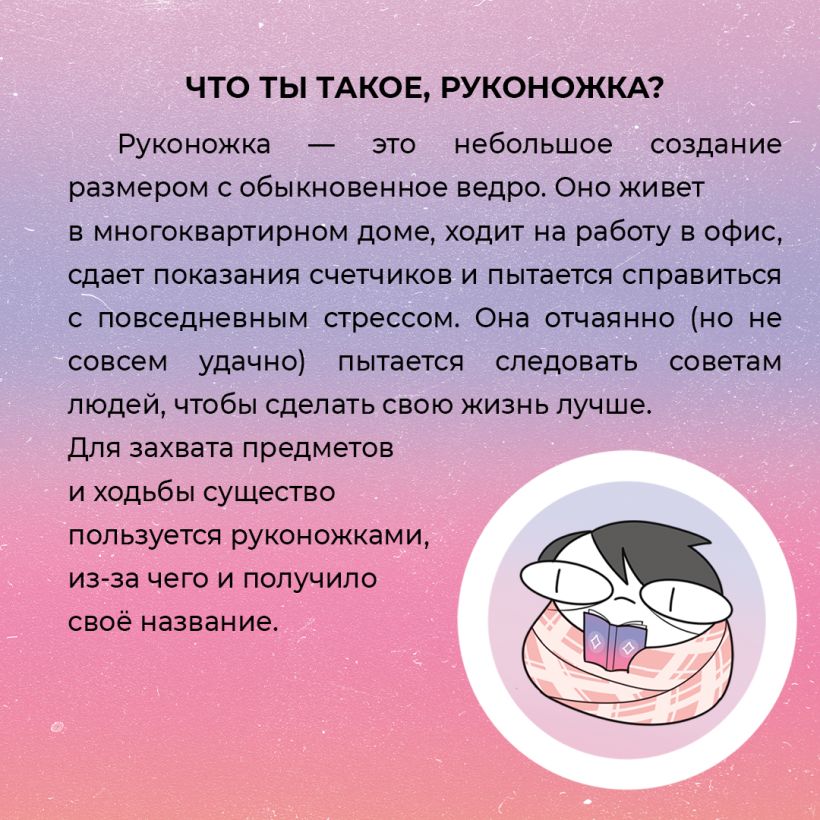 Руконожка — это небольшое создание размером с обыкновенное ведро. Оно живет в многоквартирном доме, ходит на работу в офис, сдает показания счетчиков и пытается справиться с повседневным стрессом. Она отчаянно (но не совсем удачно) пытается следовать советам людей, чтобы сделать свою жизнь лучше.