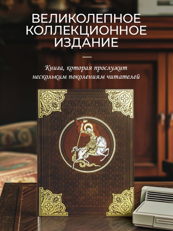 Книга в коллекционном переплете, изготовленном из натуральной гладкой кожи, украшенном тончайшим тиснением в русском стиле. На передней сторонке изображен св. Георгий Победоносец, поражающий змия, на корешке использован рукописный шрифт. Книга отпечатана на белой бумаге с легкой текстурой. Более 150-ти редких графических иллюстраций в тексте.