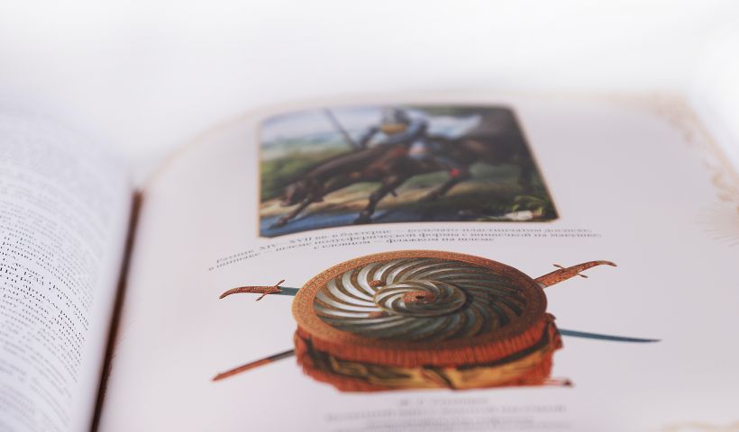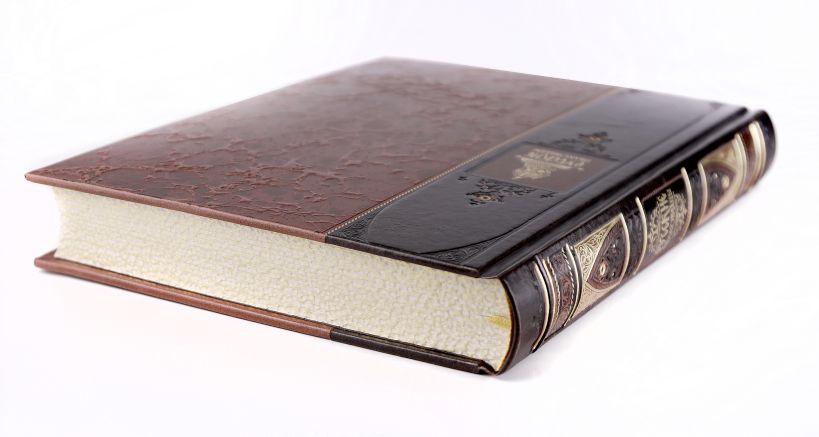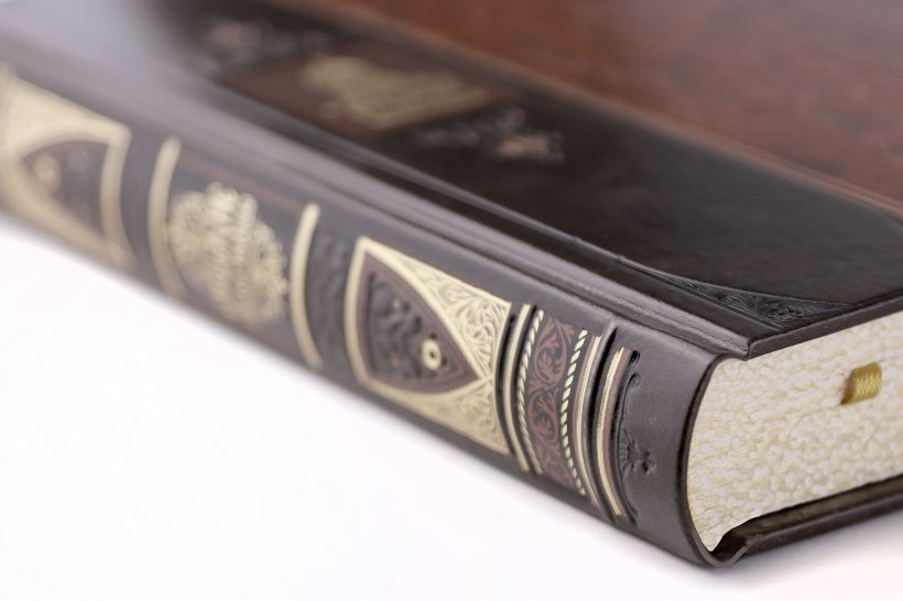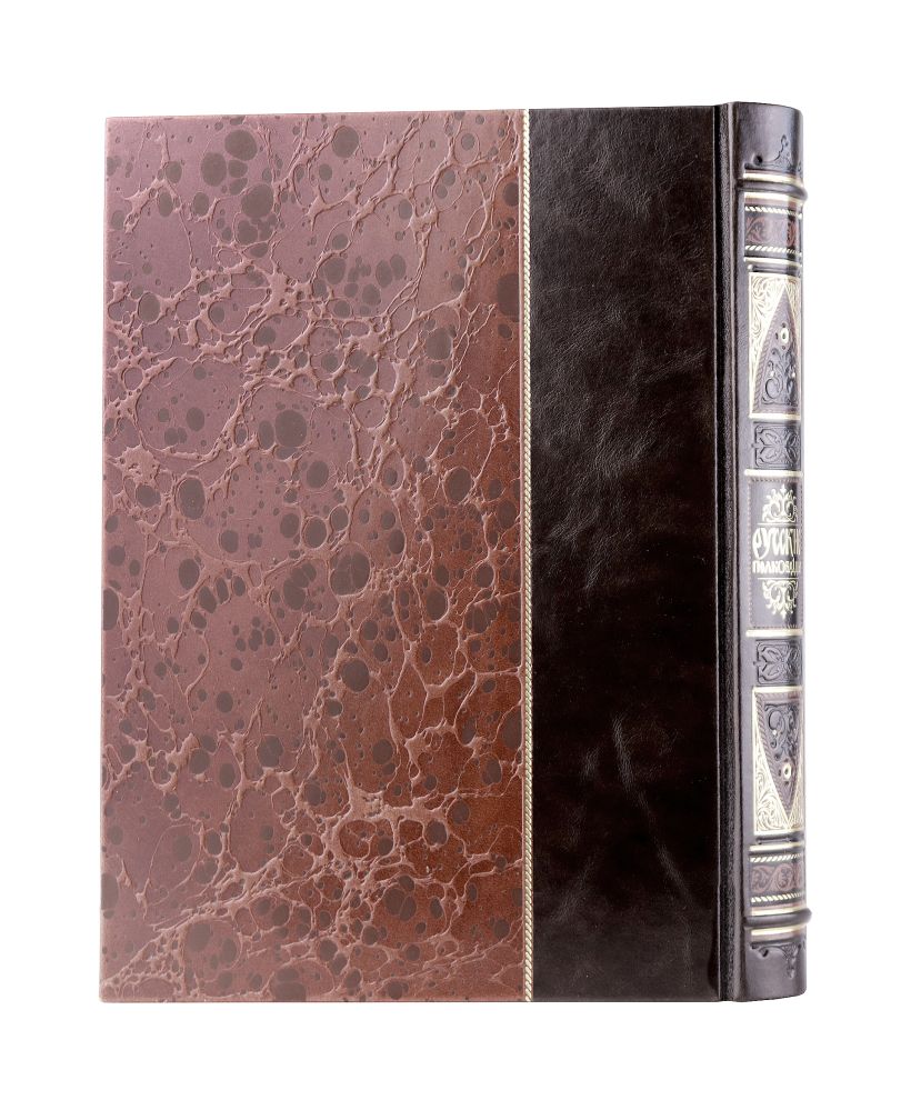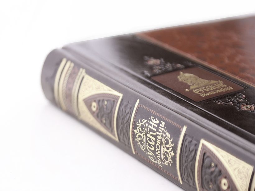 Книга в коллекционном инкрустированном переплете. Переплет изготовлен их двух видов натуральной кожи по технологии XIX века и украшен сплошным тончайшим тиснением в стиле «русская эклектика» и тиснением, повторяющим узор «мраморная бумага», в полном соответствии с лучшими образцами переплетов русских мастеров начала века. Использовано 3 вида тиснения — золото, натуральные пигменты и глубокое рельефное тиснение. Благодаря классическому оформлению книга будет отлично смотреться на любой книжной полке. Лента для закладывания страниц и каптал, скрепляющий верх и низ объемного тома, изготовлены из шелка. Бумага в книге легкая, матовая, что обеспечивает комфортное чтение даже длительное время, цветные иллюстрации напечатаны на мелованной бумаге. Обрез книги окрашен, торшонирован и вызолочен вручную. К книге прилагается сертификат, отпечатанный на бумаге сорта «верже», подтверждающий уникальность издания, он вложен в каждый экземпляр и пронумерован вручную.