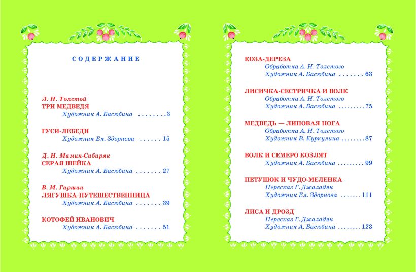 В книгу «Русские сказки о животных» вошло 11 сказок, среди которых всеми любимые «Три медведя», «Гуси-лебеди», «Лисичка-сестричка и серый волк», «Лягушка-путешественница» и другие.