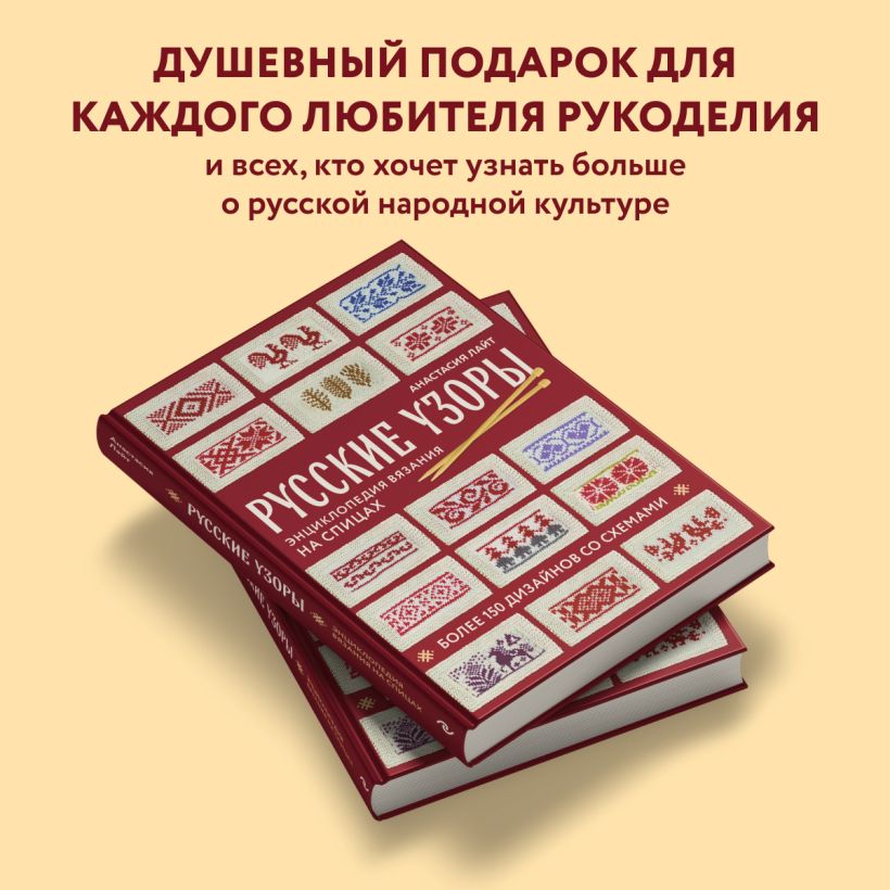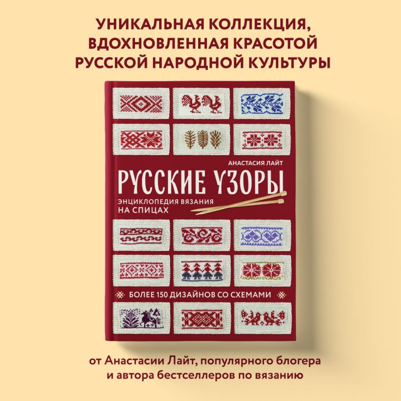 «Вы прикоснетесь к исконно русским вековым традициям и сохраните для будущих поколений уникальные народные орнаменты. Вязание — увлекательное дело, а вязать узоры, которые вышивали наши бабушки и прабабушки, бесценно!» — так считает замечательный мастер Анастасия Лайт, и, более того, она уверена, что традиционные народные мотивы нашего народа должны сменить поднадоевшие уже, но до сих пор модные норвежские узоры в современном вязании.