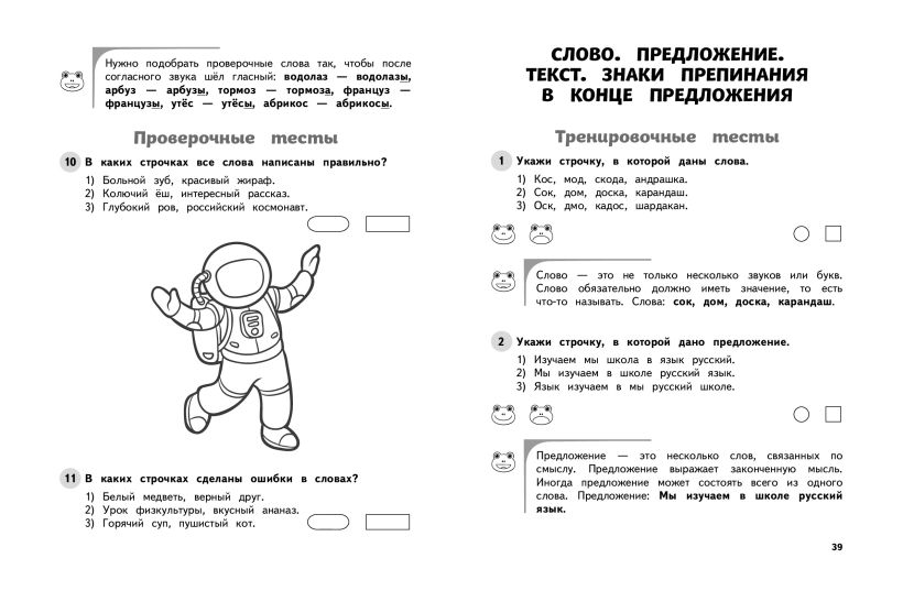 Тренажёры содержат тесты по важнейшим предметам начальной школы — математике и русскому языку. По каждой теме предлагается два вида тестов — тренировочные и проверочные. Выполняя тренировочные тесты, младшие школьники смогут не только выяснить свой уровень усвоения учебного материала, но и оперативно получить краткие и понятные разъяснения по проблемным темам. Эти подсказки ориентируют учеников на выбор нужного правила и дают прямые указания на верный способ выполнения задания. Проверочные тесты с ответами в конце книги выполняют контрольную функцию. Сборник тестов разработан с учётом всех требований ФГОС начального общего образования.