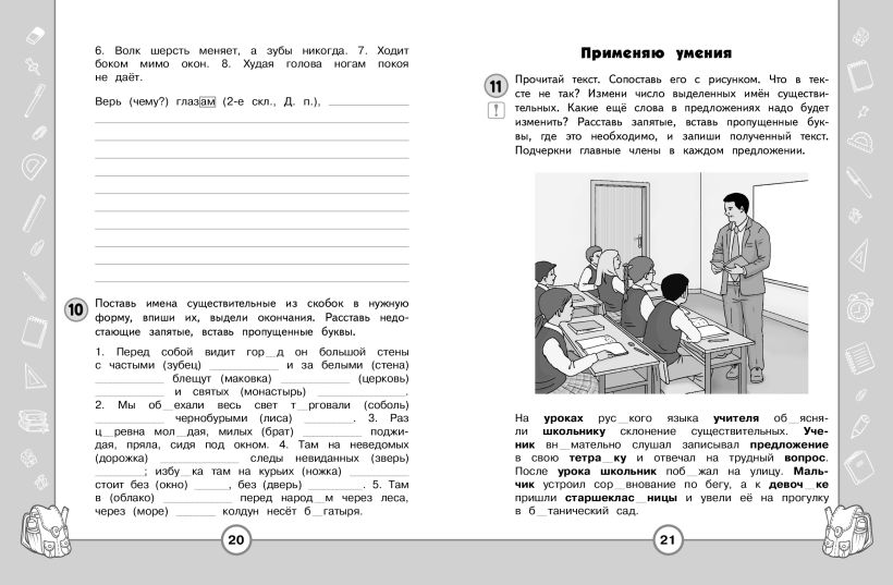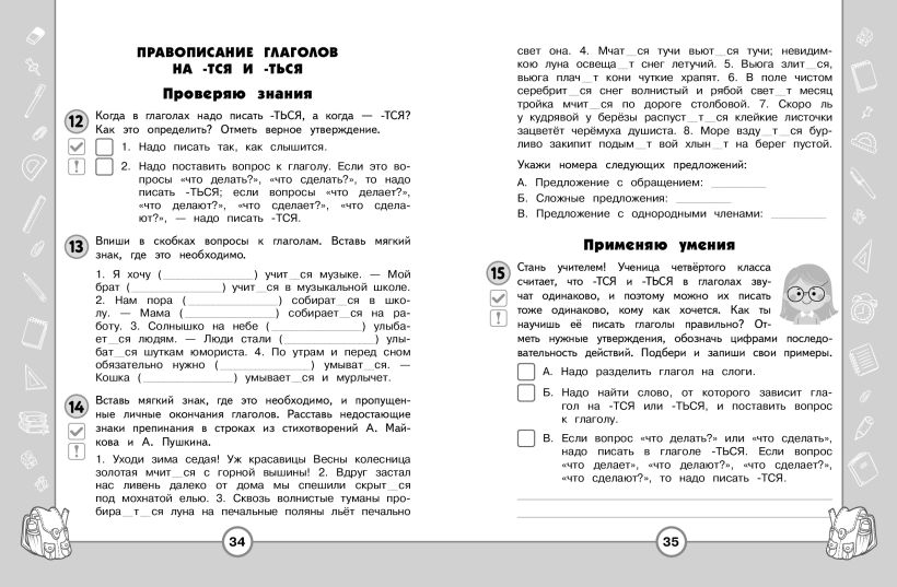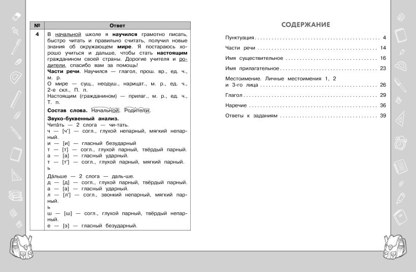 Тренажёр создан с целью научить четвероклассника применять на практике полученные знания. Каждая тема содержит задания как на самостоятельную проверку знаний, так и на их применение для решения самых разных практических задач. Выполнение заданий будет способствовать развитию не только языковой и речевой грамотности школьника, но и его функциональной грамотности.