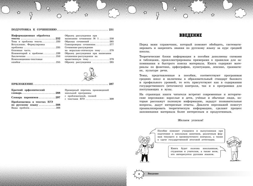 В книге представлены разделы «Фонетика», «Морфемика и словообразование», «Грамматика», «Орфография», «Пунктуация», «Выразительность русской речи». Помимо этого, в конце пособия вы найдете полезную информацию о том, как писать сочинения, а также словари паронимов и орфоэпических трудностей.