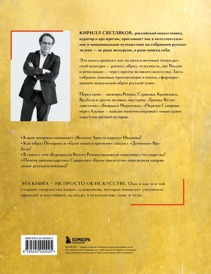 Издание создано в подарочном формате на плотной мелованной бумаге, с высоким качеством печати и сдержанным, благородным золотым оформлением. Это не просто альбом, а ценное дополнение к библиотеке каждого, кто интересуется историей и культурой своей страны. Вместе с богатым иллюстративным рядом автор книги — Кирилл Светляков, известный искусствовед, куратор выставок, арт-критик — предлагает доступное, но глубокое прочтение ключевых образов русской живописи, помогает увидеть за формой — содержание, за сюжетом — идею, за красками — культурный код.