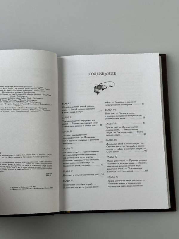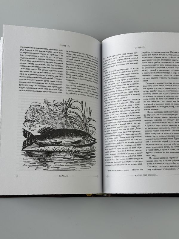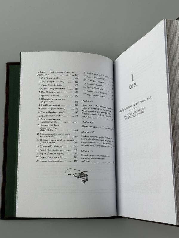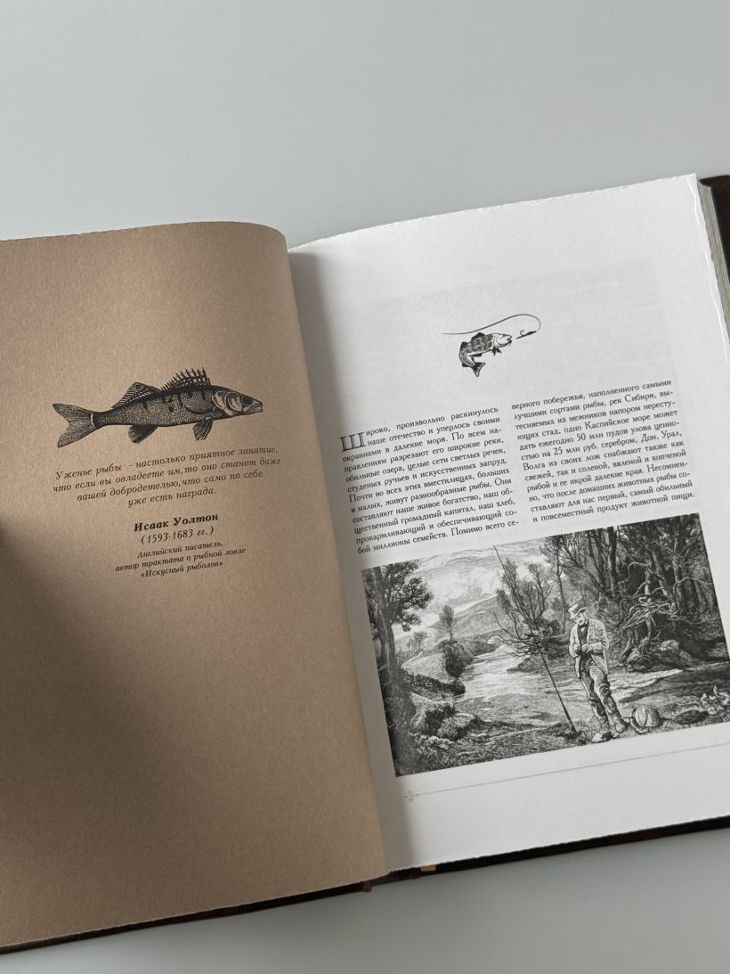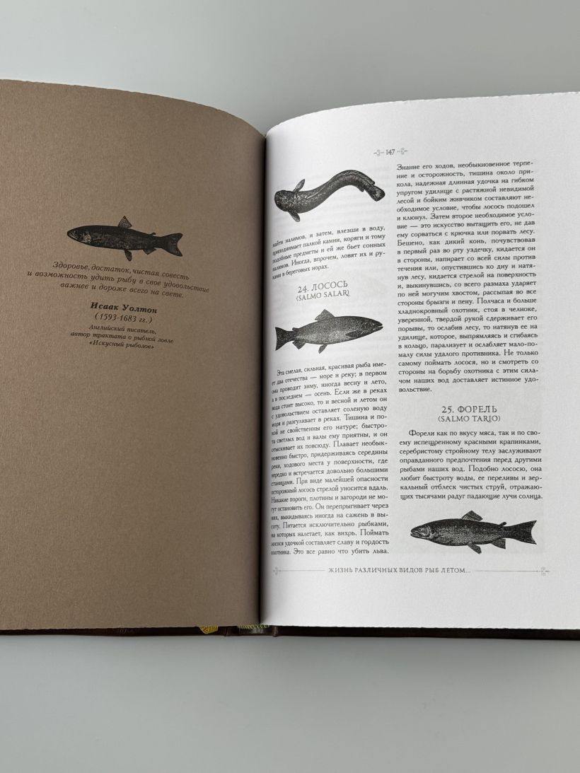 Коллекционное подарочное издание в изящном переплете ручной работы. Переплет изготовлен по технологиям XIX века из кожи натурального дубления, с применением каратной золотой фольги и натурального пигмента; оформлен по авторским рисункам, созданным специально для данного издания. В оформлении переплета использованы геометрические и растительные орнаменты, в сочетании с гравированными изображениями промысловых рыб. Обрезы торшонированы. Форзацы и накидки с цитатами из дизайнерской хлопковой бумаги песочного цвета бумаги. Каптал и ляссе золотистого цвета. Блок отпечатан на бумаге цвета слоновой кости, в книге более 200 графических иллюстраций. Книга в кожаном переплете ручной работы послужит нескольким поколениям читателей.