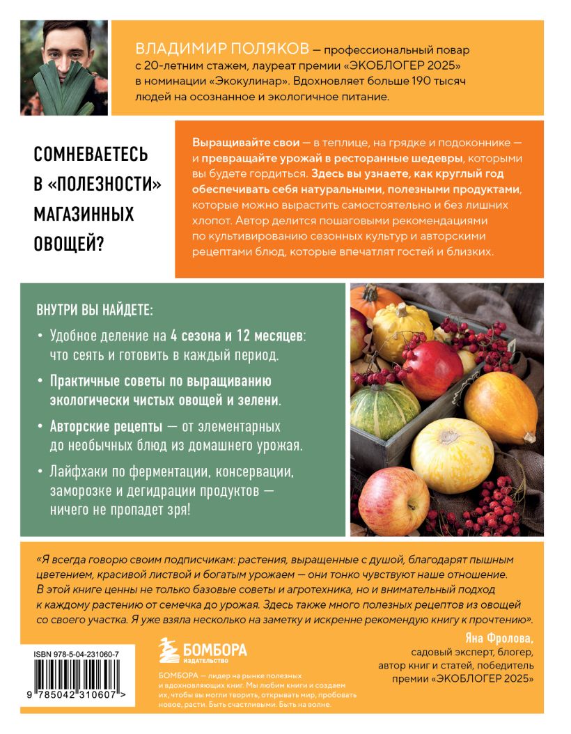 Также в книге множество очень нужных и полезных рецептов из овощей, выращенных на своем участке. Для себя взяла уже несколько рецептов на заметку и однозначно рекомендую книгу к прочтению». — Яна Фролова, садовый эксперт, блогер, автор книг и статей, победитель премии «ЭКОБЛОГЕР 2025»