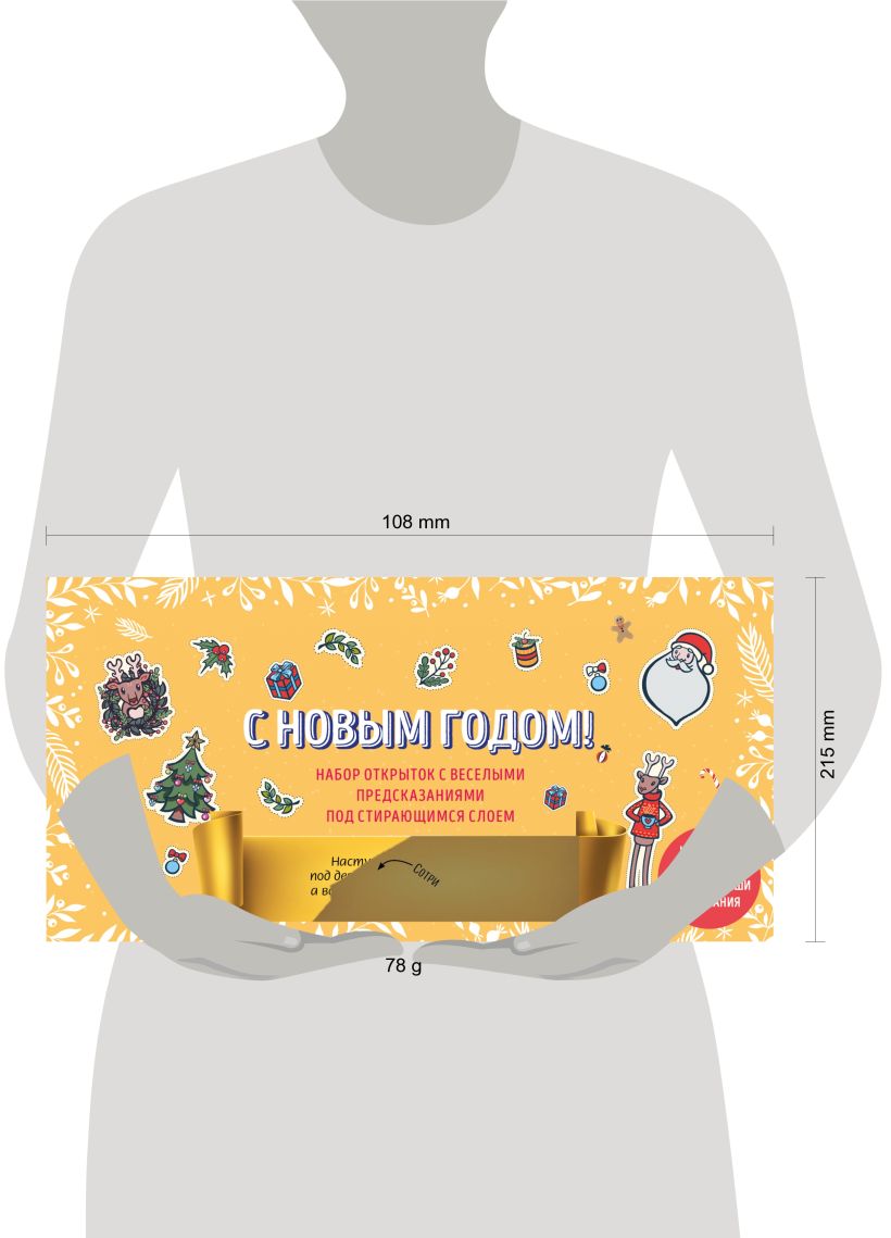 12 красивых новогодних открыток. На лицевой стороне каждой открытки под скретч-слоем, стереть который можно любым металлическим предметом, находится остроумное и веселое предсказание. На оборотной стороне — форма для самостоятельного заполнения, в которую вы можете вписать свои пожелания родным и друзьям к Новому году.