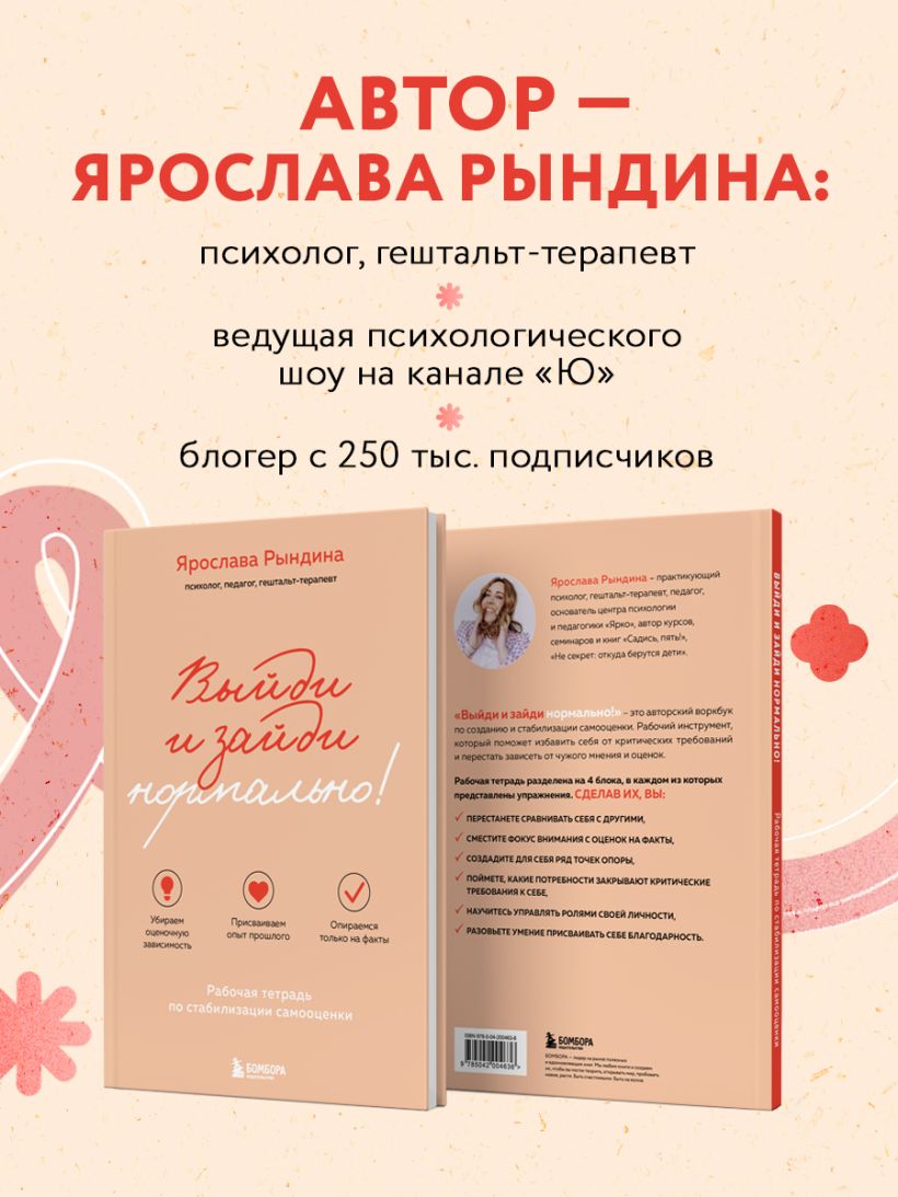 «Выйди и зайди нормально» — это авторский воркбук по созданию и стабилизации самооценки. Рабочий инструмент, который поможет избавить себя от критических требований и перестать зависеть от чужого мнения и оценок.