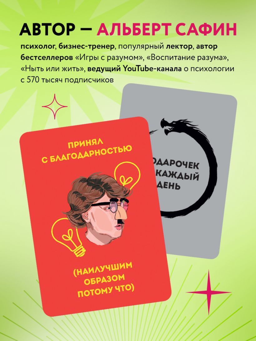 «Подарочек на каждый день» — авторские карты с забавными изображениями и цитатами из любимых книг Альберта Сафина, с помощью которых вы можете: