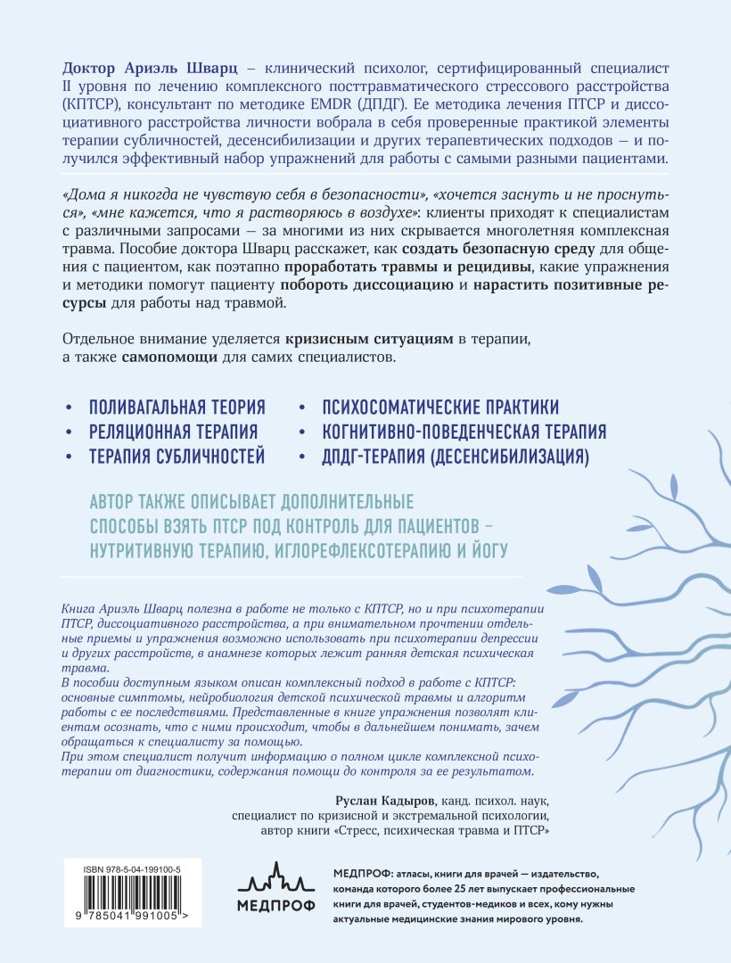 В своем практическом руководстве по работе с комплексным посттравматическим расстройством доктор Ариэль Шварц, клинический психолог и специалист по К-ПТСР, излагает разностороннюю методику терапии случаев К-ПТСР. Изложенная в форме понятных терапевтических упражнений-опросников, теоретических обоснований и случаев из практики, методика доктора Шварц станет полезным инструментом в арсенале разных специалистов, работающих с психотравмами: от психологов до психиатров. Различные подходы призваны переключить внимание пациента с внутренних переживаний и ретроспективы на ощущения собственного тела и его возможностей на настоящий момент.