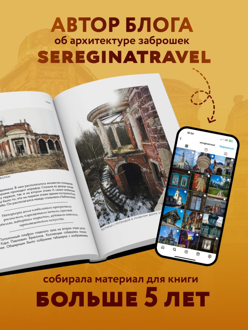 Усадьбы Подмосковья, оставленные своими владельцами, хранят истории о судьбе целых поколений. Эти истории рассказала читателям автор книги «Забытые сокровища Подмосковья. Великолепие заброшенных усадеб» Мария Серегина. Мария — создатель блога @sereginatravel, в котором она более пяти лет показывает свои путешествия по заброшенным зданиям и с помощью камеры сохраняет память об этих местах. Ее снимки открывают перед нами двери в мир заброшенных домов, на примере которых видно, как, несмотря на частично утраченную внешнюю красоту, эти здания продолжают вызывать восхищение.