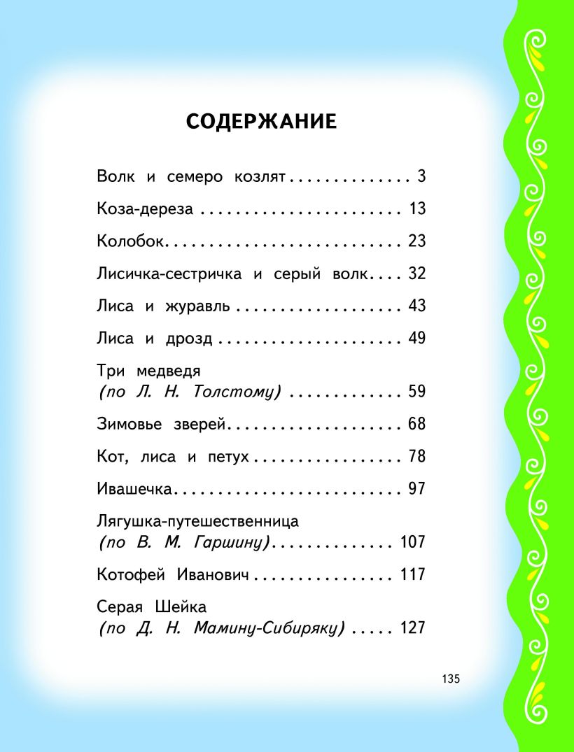 В сборник вошли самые известные сказки: "Лиса и журавль", "Коза-дереза", "Колобок", "Волк и семеро козлят", "Лиса и дрозд", "Зимовье зверей", "Кот, лиса и петух" и другие.