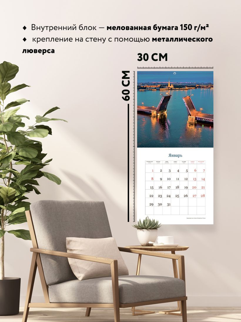 Благодаря большому формату и высокому качеству изображений этот календарь может стать отличным дополнением интерьера. В нем также отмечены выходные дни, а просторная сетка позволяет удобно планировать время и записывать важные события.