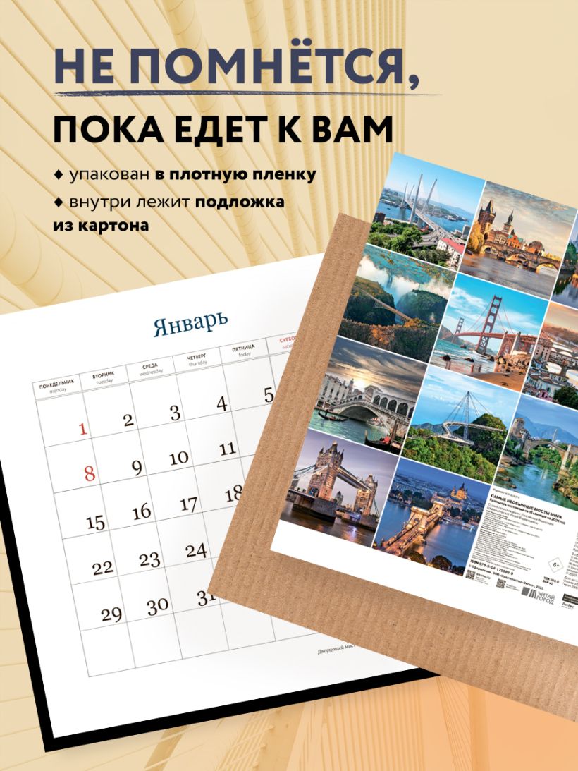 В календаре подобраны красочные фотографии самых красивых мостов на нашей планете: вы сможете насладиться и открыть для себя новое место с каждым месяцем.