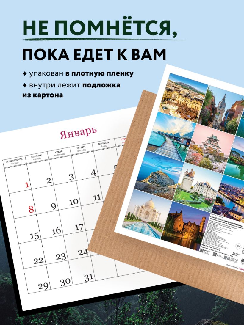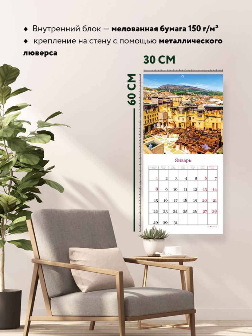 Благодаря большому формату и высокому качеству изображений этот календарь может стать отличным дополнением интерьера. В нем также отмечены выходные дни, а просторная сетка позволяет удобно планировать время и записывать важные события.